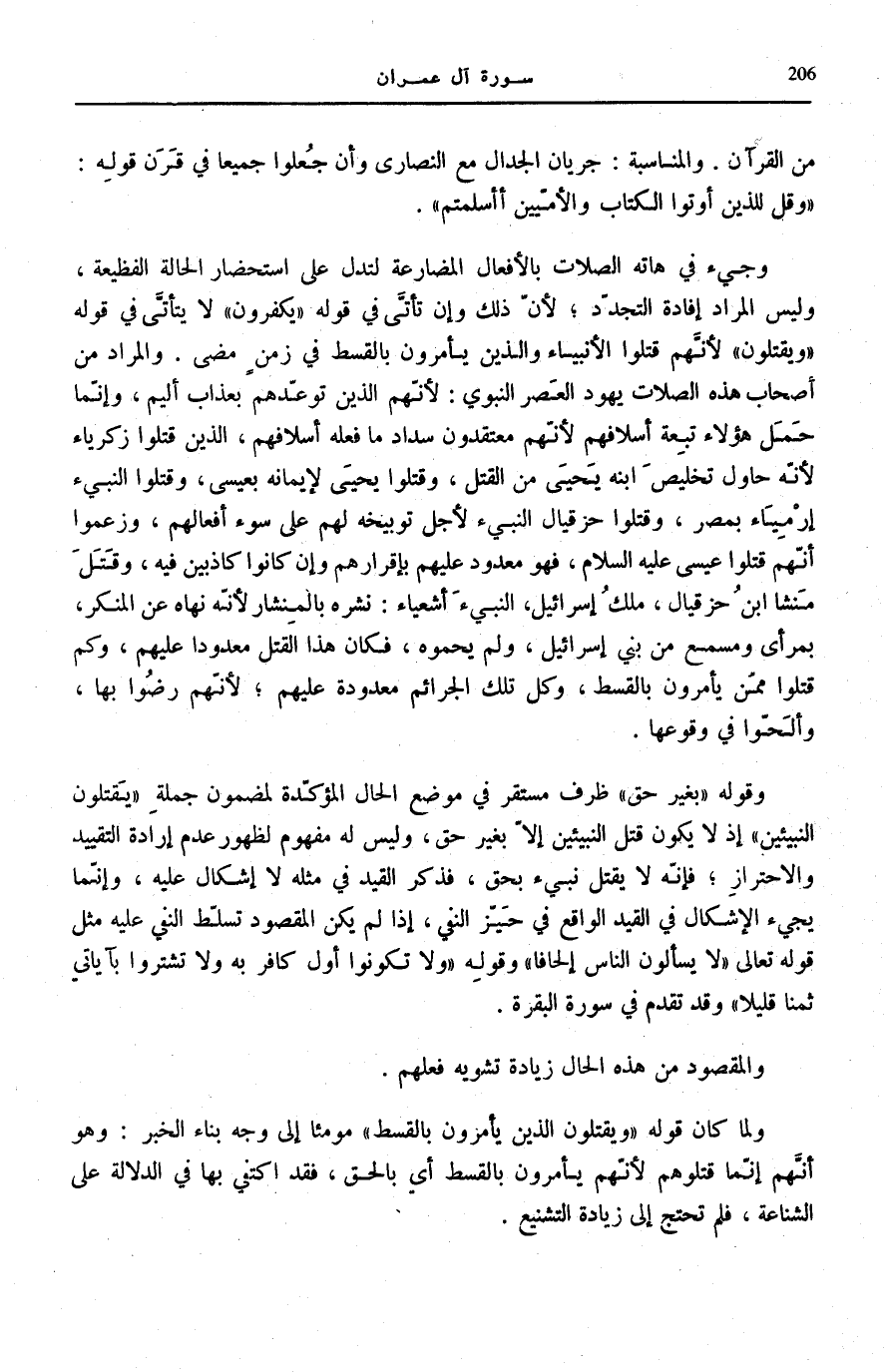 وَلَمَّا كَانَ قَوْلُهُ: وَيَقْتُلُونَ الَّذِينَ يَأْمُرُونَ بِالْقِسْطِ مُومِئًا إِلَى وَجْهِ بِنَاءِ الْخَبَرِ: وَهُوَ أَنَّهُمْ إِنَّمَا قَتَلُوهُمْ لِأَنَّهُمْ يَأْمُرُونَ بِالْقِسْطِ أَيْ بِالْحَقِّ، فَقَدِ اكْتُفِيَ بِهَا فِي الدَّلَالَةِ عَلَى الشَّنَاعَةِ، فَلَمْ تَحْتَجْ إِلَى زِيَادَةِ التَّشْنِيعِ.