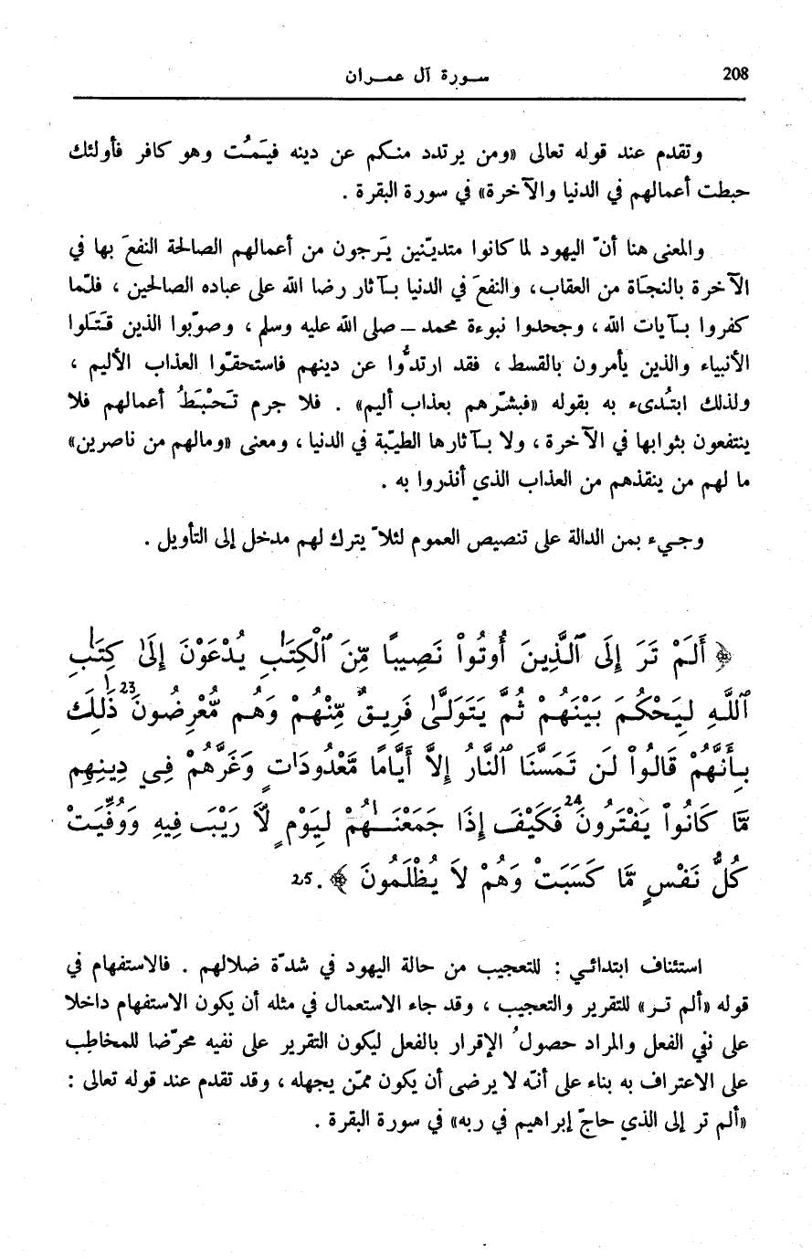 أَلَمْ تَرَ إِلَى الَّذِينَ أُوتُوا نَصِيباً مِنَ الْكِتابِ يُدْعَوْنَ إِلى كِتابِ اللَّهِ لِيَحْكُمَ بَيْنَهُمْ ثُمَّ يَتَوَلَّى فَرِيقٌ مِنْهُمْ وَهُمْ مُعْرِضُونَ (23) ذلِكَ بِأَنَّهُمْ قالُوا لَنْ تَمَسَّنَا النَّارُ إِلاَّ أَيَّاماً مَعْدُوداتٍ وَغَرَّهُمْ فِي دِينِهِمْ مَا كانُوا يَفْتَرُونَ (24) فَكَيْفَ إِذا جَمَعْناهُمْ لِيَوْمٍ لَا رَيْبَ فِيهِ وَوُفِّيَتْ كُلُّ نَفْسٍ مَا كَسَبَتْ وَهُمْ لَا يُظْلَمُونَ (25)