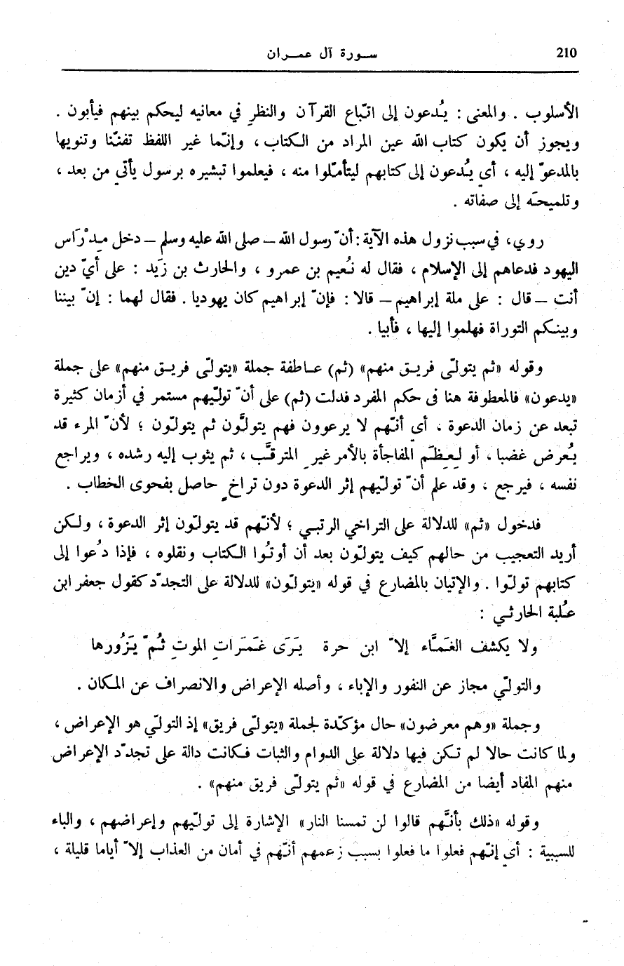 فَدُخُولُ ثُمَّ لِلدَّلَالَةِ عَلَى التَّرَاخِي الرُّتَبِيِّ لِأَنَّهُمْ قَدْ يَتَوَلَّوْنَ إِثْرَ الدَّعْوَةِ، وَلَكِنْ أُرِيدَ التَّعْجِيبُ مِنْ حَالِهِمْ كَيْفَ يَتَوَلَّوْنَ بَعْدَ أَنْ أُوتُوا الْكِتَابَ وَنَقَلُوهُ، فَإِذَا دُعُوا إِلَى كِتَابِهِمْ تَوَلَّوْا. وَالْإِتْيَانُ بِالْمُضَارِعِ فِي قَوْلِهِ: يَتَوَلَّوْنَ لِلدَّلَالَةِ عَلَى التَّجَدُّدِ كَقَوْلِ جَعْفَرِ ابْن عُلْبَةَ الْحَارِثِيِّ: