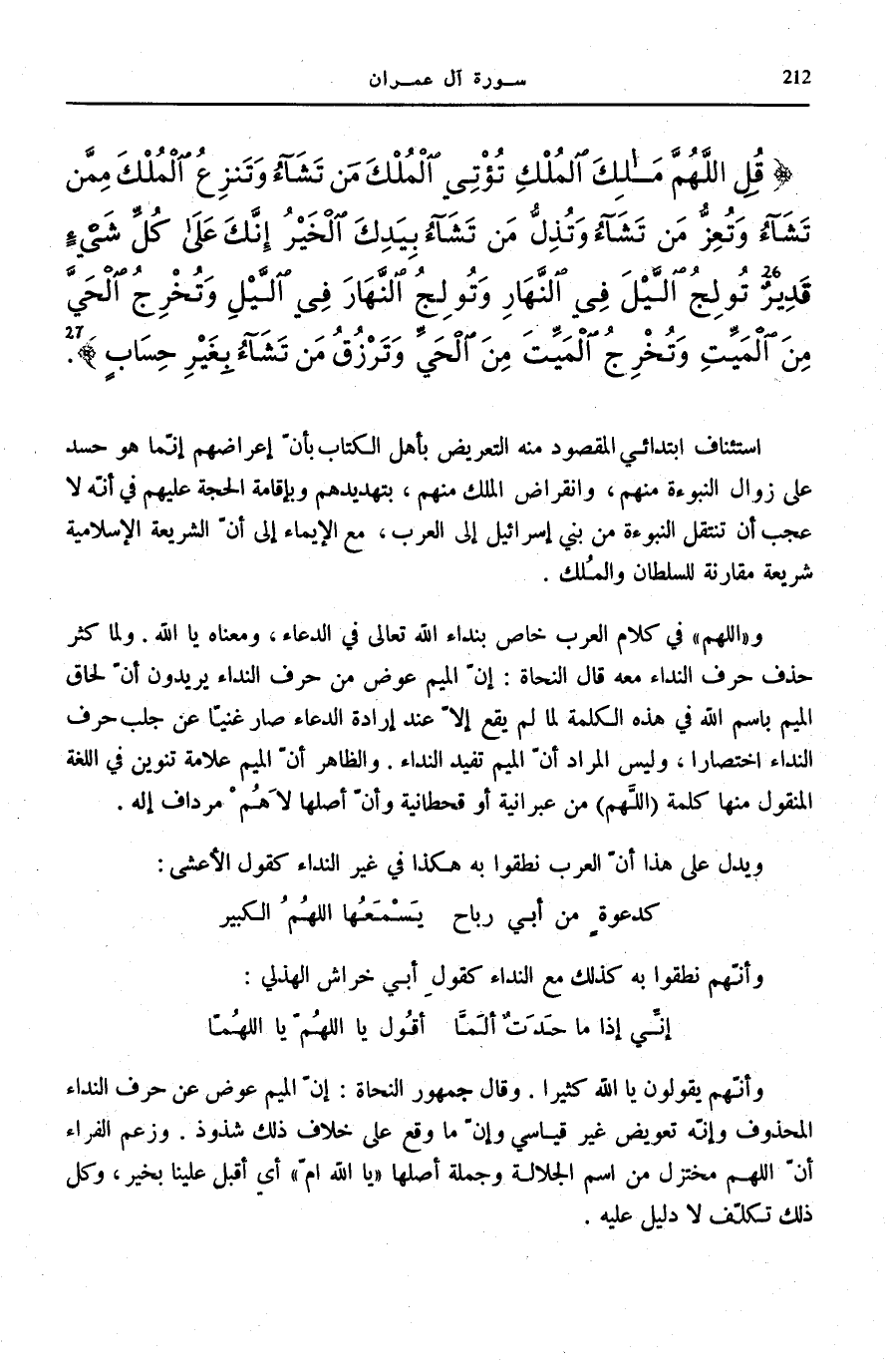 قُلِ اللَّهُمَّ مالِكَ الْمُلْكِ تُؤْتِي الْمُلْكَ مَنْ تَشاءُ وَتَنْزِعُ الْمُلْكَ مِمَّنْ تَشاءُ وَتُعِزُّ مَنْ تَشاءُ وَتُذِلُّ مَنْ تَشاءُ بِيَدِكَ الْخَيْرُ إِنَّكَ عَلى كُلِّ شَيْءٍ قَدِيرٌ (26) تُولِجُ اللَّيْلَ فِي النَّهارِ وَتُولِجُ النَّهارَ فِي اللَّيْلِ وَتُخْرِجُ الْحَيَّ مِنَ الْمَيِّتِ وَتُخْرِجُ الْمَيِّتَ مِنَ الْحَيِّ وَتَرْزُقُ مَنْ تَشاءُ بِغَيْرِ حِسابٍ (27)