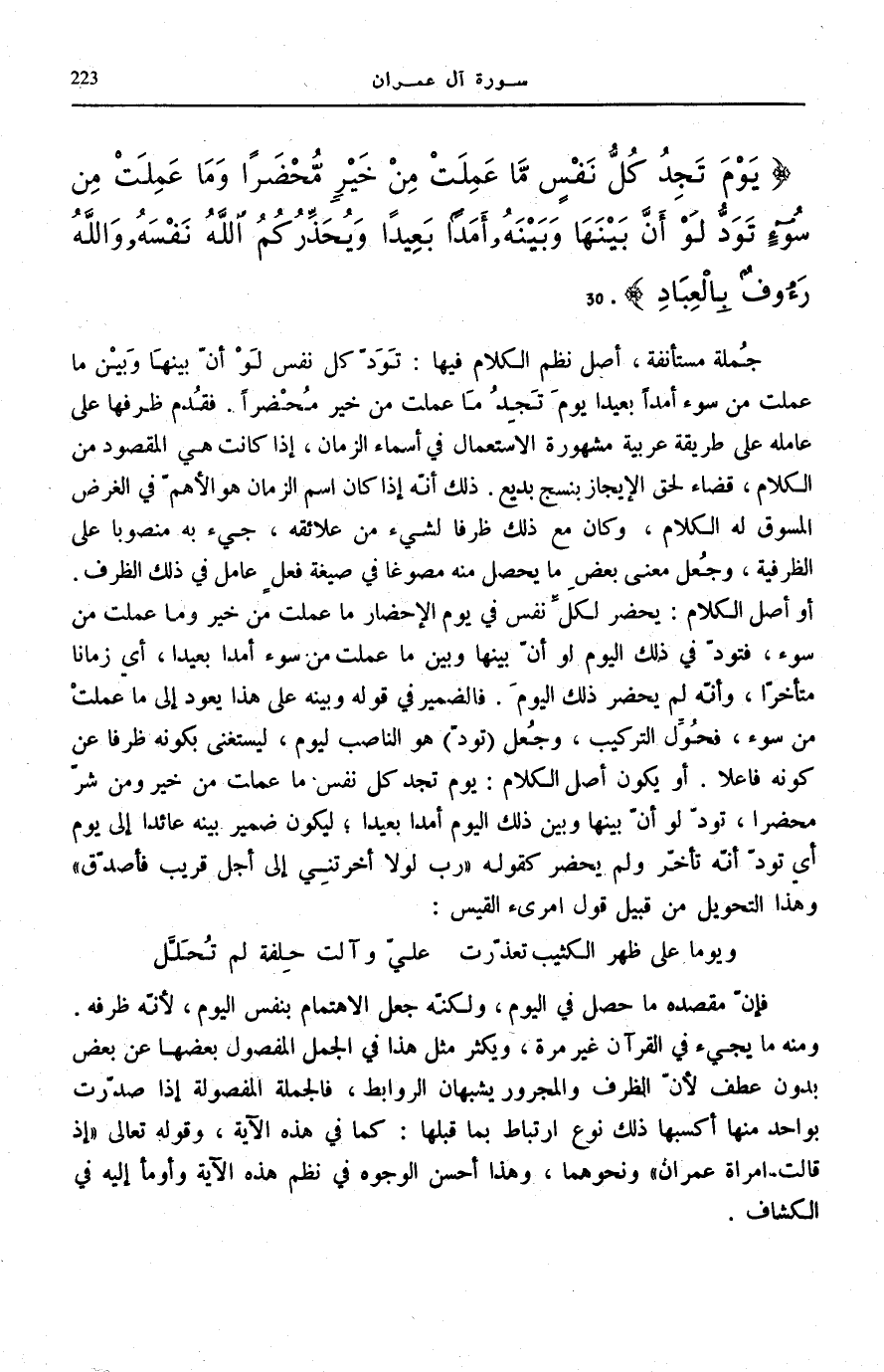 يَوْمَ تَجِدُ كُلُّ نَفْسٍ مَا عَمِلَتْ مِنْ خَيْرٍ مُحْضَراً وَما عَمِلَتْ مِنْ سُوءٍ تَوَدُّ لَوْ أَنَّ بَيْنَها وَبَيْنَهُ أَمَداً بَعِيداً وَيُحَذِّرُكُمُ اللَّهُ نَفْسَهُ وَاللَّهُ رَؤُفٌ بِالْعِبادِ (30)