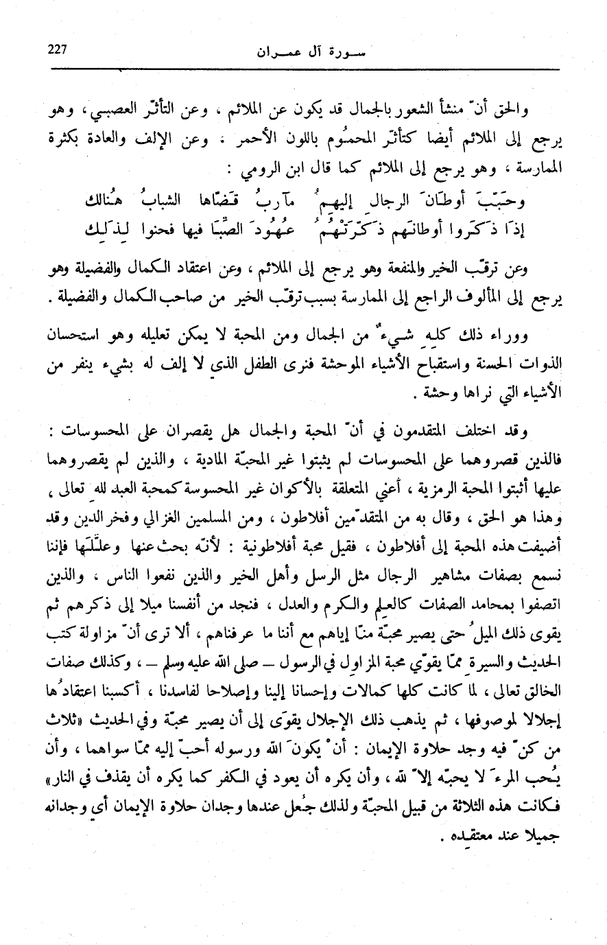 الدِّينِ وَقَدْ أُضِيفَتْ هَذِهِ الْمَحَبَّةُ إِلَى أَفْلَاطُونَ، فَقِيلَ مَحَبَّةٌ أَفْلَاطُونِيَّةٌ: لِأَنَّهُ بَحَثَ عَنْهَا وَعَلَّلَهَا فَإِنَّنَا نَسْمَعُ بِصِفَاتِ مَشَاهِيرِ الرِّجَالِ مِثْلِ الرُّسُلِ وَأَهْلِ الْخَيْرِ وَالَّذِينَ نَفَعُوا النَّاسَ، وَالَّذِينَ اتَّصَفُوا بِمَحَامِدِ الصِّفَاتِ كَالْعِلْمِ وَالْكَرَمِ وَالْعَدْلِ، فَنَجِدُ مِنْ أَنْفُسِنَا مَيْلًا إِلَى ذِكْرِهِمْ ثُمَّ يَقْوَى ذَلِكَ الْمَيْلُ حَتَّى يَصِيرَ مَحَبَّةً مِنَّا إِيَّاهُمْ مَعَ أَنَّنَا مَا عَرَفْنَاهُمْ، أَلَا تَرَى أَنَّ مُزَاوَلَةَ كُتُبِ الْحَدِيثِ وَالسِّيرَةِ مِمَّا يُقَوِّي مَحَبَّةَ الْمُزَاوِلِ فِي الرَّسُولِ صَلَّى اللهُ عَلَيْهِ وَسَلَّمَ، وَكَذَلِكَ صِفَاتُ الْخَالِقِ تَعَالَى، لَمَّا كَانَتْ كُلُّهَا كَمَالَاتٍ وَإِحْسَانًا إِلَيْنَا وَإِصْلَاحًا لِفَاسِدِنَا، أَكْسَبَنَا اعْتِقَادُهَا إِجْلَالًا لِمَوْصُوفِهَا، ثُمَّ يَذْهَبُ ذَلِكَ الْإِجْلَالُ يَقْوَى إِلَى أَنْ يَصِيرَ مَحَبَّةً