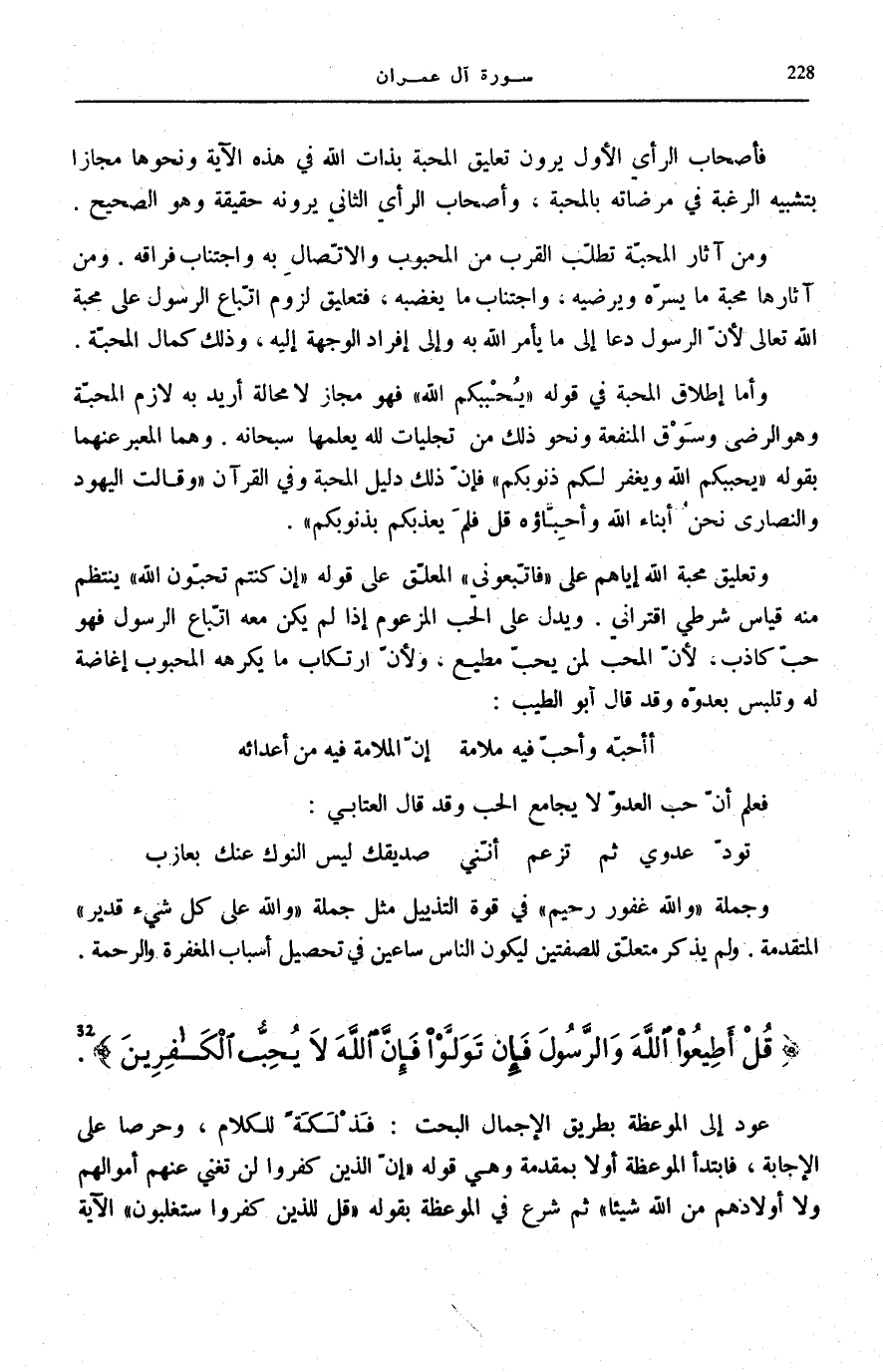 وَأَمَّا إِطْلَاقُ الْمَحَبَّةِ فِي قَوْلِهِ: يُحْبِبْكُمُ اللَّهُ فَهُوَ مَجَازٌ لَا مَحَالَةَ أُرِيدَ بِهِ لَازِمُ المحبّة وَهُوَ الرضى وَسَوْقُ الْمَنْفَعَةِ وَنَحْوُ ذَلِكَ مِنْ تَجَلِّيَاتٍ لِلَّهِ يَعْلَمُهَا سُبْحَانَهُ. وَهُمَا الْمُعَبَّرُ عَنْهُمَا بِقَوْلِهِ: يُحْبِبْكُمُ اللَّهُ وَيَغْفِرْ لَكُمْ ذُنُوبَكُمْ فَإِنَّ ذَلِكَ دَلِيلُ الْمَحَبَّةِ وَفِي الْقُرْآنِ: