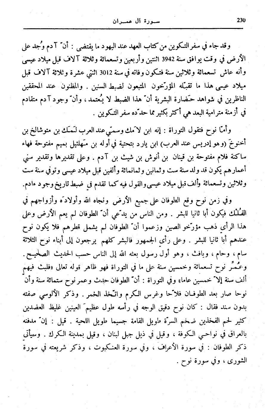 وَأَمَّا نُوحٌ فَتَقُولُ التَّوْرَاةُ: إِنَّهُ ابْنُ لَامَكَ وَسُمِّيَ عِنْدَ الْعَرَبِ لَمَكَ بْنَ مُتُوشَالِخَ بْنِ أَخْنُوخَ (وَهُوَ إِدْرِيسُ عِنْدَ الْعَرَبِ) ابْنِ يَارِدَ بِتَحْتِيَّةٍ فِي أَوَّلِهِ بْنِ مَهْلَئِيلَ بِمِيمٍ مَفْتُوحَةٍ فَهَاءٍ سَاكِنَةٍ فَلَامٍ مَفْتُوحَةٍ بْنِ قَيْنَانَ بْنِ أَنُوشَ بْنِ شِيثِ بْنِ آدَمَ. وَعَلَى تَقْدِيرِهَا وَتَقْدِيرِ سِنِيِّ أَعْمَارِهِمْ يَكُونُ قَدْ وُلِدَ سَنَةَ سِتٍّ وَثَمَانِينَ وَثَمَانِمِائَةٍ وَأَلْفَيْنِ قَبْلَ مِيلَادِ عِيسَى وَتُوُفِّيَ سَنَةَ سِتٍّ وَثَلَاثِينَ وَتِسْعِمِائَةٍ وَأَلْفٍ قَبْلَ مِيلَادِ عِيسَى وَالْقَوْلُ فِيهِ كَمَا تَقَدَّمَ فِي ضَبْطِ تَارِيخ وجود ءادم.