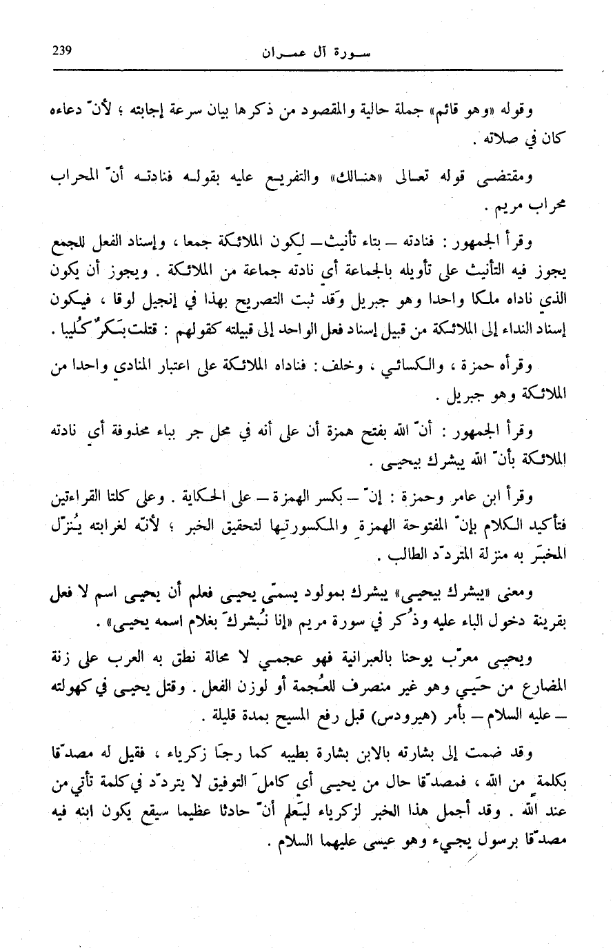 وَقَرَأَ الْجُمْهُورُ: أَنَّ اللَّهَ بِفَتْحِ هَمْزَةِ أَنَّ عَلَى أَنَّهُ فِي مَحَلِّ جَرٍّ بِبَاءٍ مَحْذُوفَةٍ أَيْ نَادَتْهُ الْمَلَائِكَةُ بِأَنَّ اللَّهَ يُبَشِّرُكَ بِيَحْيَى.
