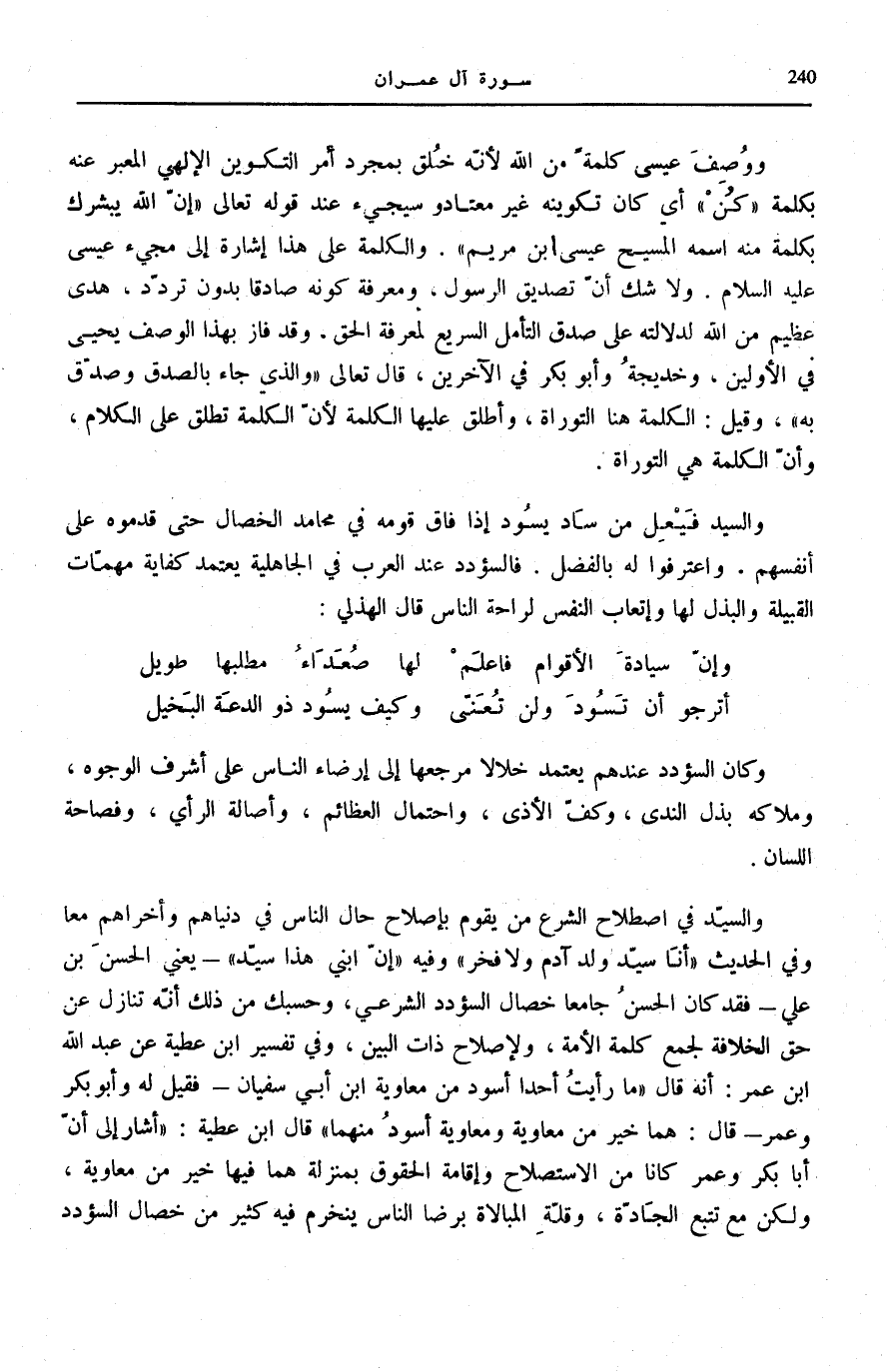 - يَعْنِي الْحَسَنَ بْنَ عَلِيٍّ- فَقَدْ كَانَ الْحَسَنُ جَامِعًا خِصَالَ السُّؤْدُدِ الشَّرْعِيِّ، وَحَسْبُكَ مِنْ ذَلِكَ أَنَّهُ تَنَازَلَ عَنْ حَقِّ الْخِلَافَةِ لِجَمْعِ كَلِمَةِ الْأُمَّةِ، وَلِإِصْلَاحِ ذَاتِ الْبَيْنِ، وَفِي تَفْسِيرِ ابْنِ عَطِيَّةَ عَنْ عَبْدِ اللَّهِ بْنِ عُمَرَ: أَنَّهُ قَالَ: «مَا رَأَيْتُ أَحَدًا أَسْوَدَ مِنْ مُعَاوِيَةَ ابْن أَبِي سُفْيَانَ- فَقِيلَ لَهُ وَأَبُو بَكْرٍ وَعُمَرُ- قَالَ: هُمَا خَيْرٌ مِنْ مُعَاوِيَةَ وَمُعَاوِيَةُ أَسْوَدُ مِنْهُمَا» قَالَ ابْنُ عَطِيَّةَ: «أَشَارَ إِلَى أَنَّ أَبَا بَكْرٍ وَعُمَرَ كَانَا مِنَ الِاسْتِصْلَاحِ وَإِقَامَةِ الْحُقُوقِ بِمَنْزِلَةٍ هُمَا فِيهَا خَيْرٌ مِنْ مُعَاوِيَةَ، وَلَكِنْ مَعَ تَتَبُّعِ الْجَادَّةِ، وَقِلَّةِ الْمُبَالَاةِ بِرِضَا النَّاسِ يَنْخَرِمُ فِيهِ كَثِيرٌ مِنْ خِصَالِ السُّؤْدُدِِِ