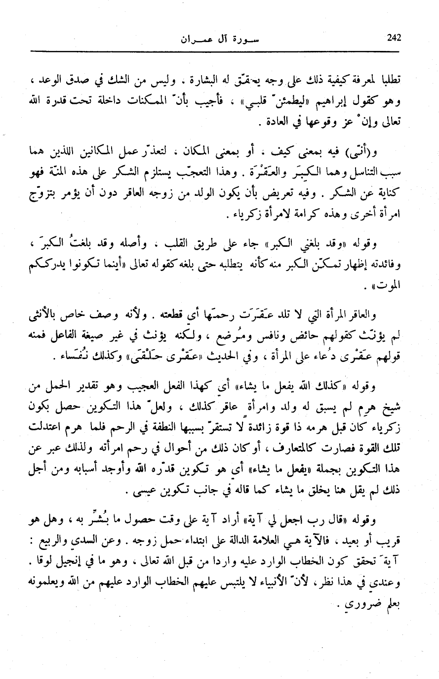 شَيْخٍ هَرِمٍ لَمْ يَسْبِقْ لَهُ وَلَدٌ وَامْرَأَةٌ عَاقِرٌ كَذَلِكَ، وَلَعَلَّ هَذَا التَّكْوِينَ حَصَلَ بِكَوْنِ زَكَرِيَّاءَ كَانَ قَبْلَ هِرَمِهِ ذَا قُوَّةٍ زَائِدَةٍ لَا تَسْتَقِرُّ بِسَبَبِهَا النُّطْفَةُ فِي الرَّحِمِ فَلَمَّا هَرِمَ اعْتَدَلَتْ تِلْكَ الْقُوَّةُ فَصَارَتْ كَالْمُتَعَارَفِ، أَوْ كَانَ ذَلِكَ مِنْ أَحْوَالٍ فِي رَحِمِ امْرَأَتِهِ وَلِذَلِكَ عَبَّرَ عَنْ هَذَا التَّكْوِينِ بِجُمْلَةِ يَفْعَلُ مَا يَشاءُ أَيْ هُوَ تَكْوِينُ قَدَّرَهُ اللَّهُ وَأَوْجَدَ أَسْبَابَهُ وَمِنْ أَجْلِ ذَلِكَ لَمْ يَقُلْ هُنَا يَخْلُقُ مَا يَشَاءُ كَمَا قَالَهُ فِي جَانِبِ تَكْوِينِ عِيسَى.