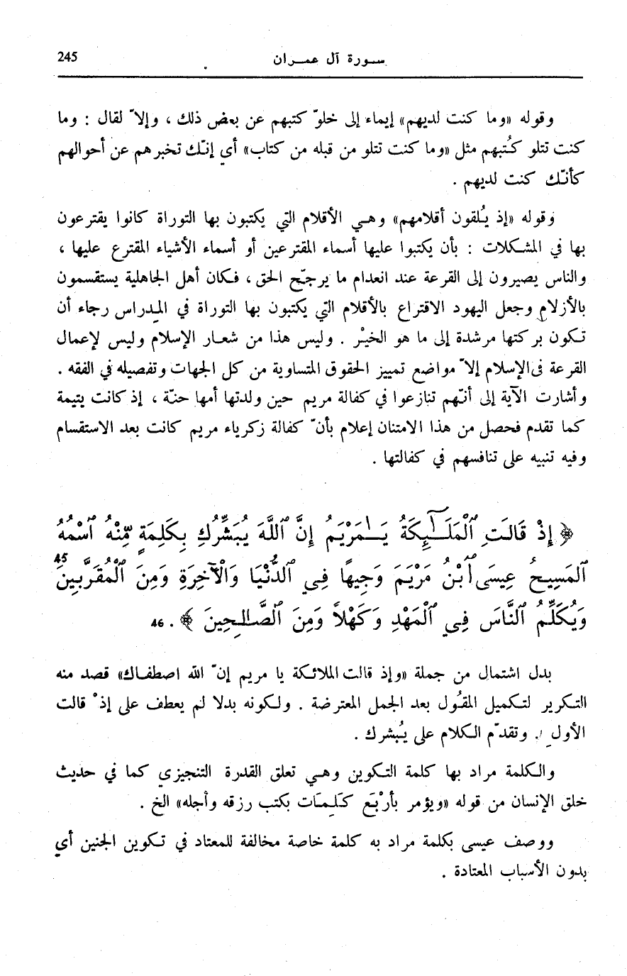 وَقَوْلُهُ: إِذْ يُلْقُونَ أَقْلامَهُمْ وَهِيَ الْأَقْلَامُ الَّتِي يَكْتُبُونَ بِهَا التَّوْرَاةَ كَانُوا يَقْتَرِعُونَ بِهَا فِي الْمُشْكِلَاتِ: بِأَنْ يَكْتُبُوا عَلَيْهَا أَسْمَاءَ الْمُقْتَرِعِينَ أَوْ أَسْمَاءَ الْأَشْيَاءِ الْمُقْتَرَعِ عَلَيْهَا، وَالنَّاسُ يَصِيرُونَ إِلَى الْقُرْعَةِ عِنْدَ انْعِدَامِ مَا يُرَجِّحُ الْحَقَّ، فَكَانَ أَهْلُ الْجَاهِلِيَّةِ يَسْتَقْسِمُونَ بِالْأَزْلَامِ وَجَعَلَ الْيَهُودُ الِاقْتِرَاعَ بِالْأَقْلَامِ الَّتِي يَكْتُبُونَ بِهَا التَّوْرَاةَ فِي الْمِدْرَاسِ رَجَاءَ أَنْ تَكُونَ بَرَكَتُهَا مُرْشِدَةً إِلَى مَا هُوَ الْخَيْرُ. وَلَيْسَ هَذَا مِنْ شِعَارِ الْإِسْلَامِ وَلَيْسَ لِإِعْمَالِ الْقُرْعَةِ فِي الْإِسْلَامِ إِلَّا مَوَاضِعُ تَمْيِيزِ الْحُقُوقِ الْمُتَسَاوِيَةِ مِنْ كُلِّ الْجِهَاتِ وَتَفْصِيلُهُ فِي الْفِقْهِ.