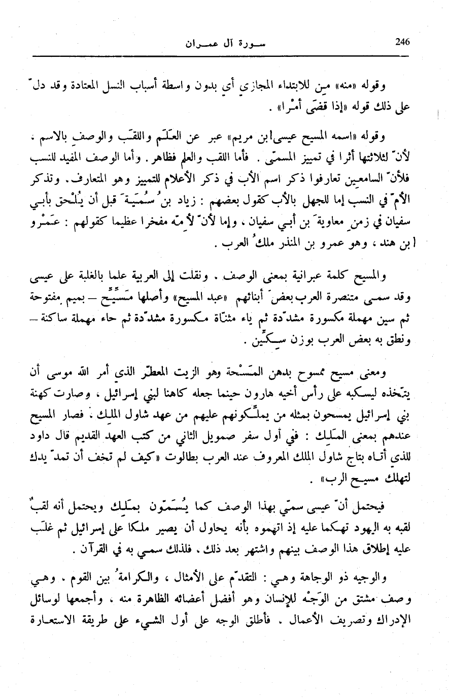 وَقَوْلُهُ: اسْمُهُ الْمَسِيحُ عِيسَى ابْنُ مَرْيَمَ عَبَّرَ عَنِ الْعَلَمِ وَاللَّقَبِ وَالْوَصْفِ بِالِاسْمِ.