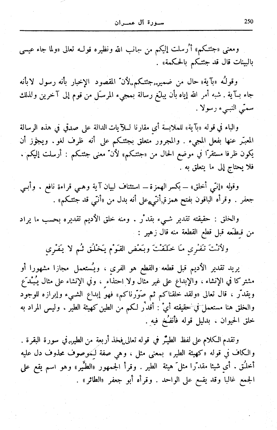 وَالْبَاءُ فِي قَوْلِهِ بِآيَةٍ لِلْمُلَابَسَةِ أَيْ مُقَارِنًا لِلْآيَاتِ الدَّالَّةِ عَلَى صِدْقِي فِي هَذِهِ الرِّسَالَةِ الْمُعَبَّرِ عَنْهَا بِفِعْلِ الْمَجِيءِ. وَالْمَجْرُور مُتَعَلق بجئتكم عَلَى أَنَّهُ ظَرْفُ لَغْوٍ، وَيَجُوزُ أَنْ يَكُونَ ظَرْفًا مُسْتَقِرًّا فِي مَوْضِعِ الْحَالِ مِنْ جِئْتُكُمْ لِأَنَّ مَعْنَى جِئْتُكُمْ: أُرْسِلْتُ إِلَيْكُمْ، فَلَا يَحْتَاجُ إِلَى مَا يَتَعَلَّقُ بِهِ. وَقَوْلُهُ: أَنِّي أَخْلُقُ- بِكَسْرِ الْهَمْزَةِ- اسْتِئْنَافٌ لِبَيَانِ آيَةٍ وَهِيَ قِرَاءَةُ نَافِعٍ، وَأَبِي جَعْفَرٍ. وَقَرَأَهُ الْبَاقُونَ بِفَتْحِ هَمْزَةِ أَنِّي عَلَى أَنَّهُ بَدَلٌ مِنْ أَنِّي قَدْ جِئْتُكُمْ.