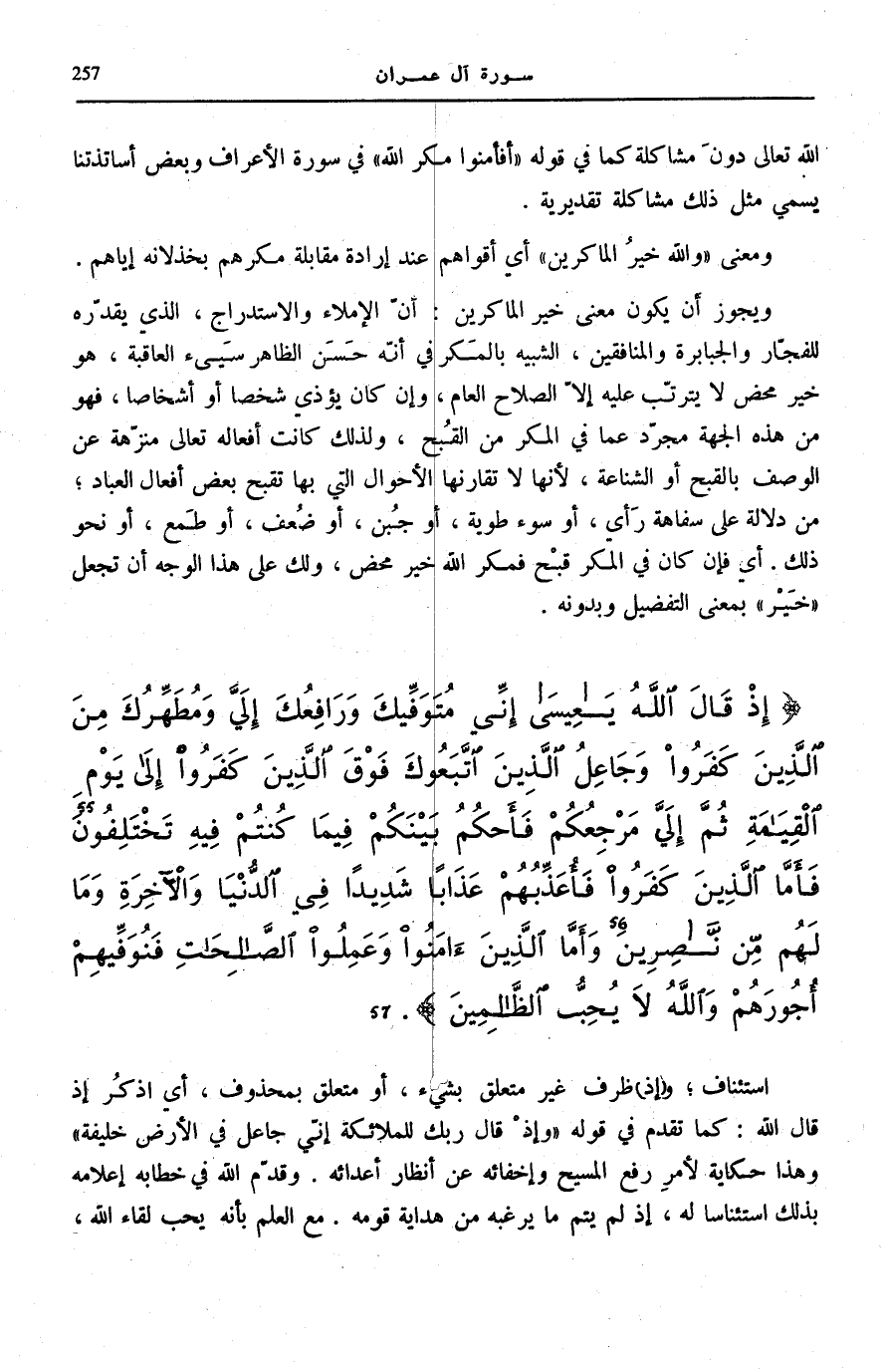 إِذْ قالَ اللَّهُ يَا عِيسى إِنِّي مُتَوَفِّيكَ وَرافِعُكَ إِلَيَّ وَمُطَهِّرُكَ مِنَ الَّذِينَ كَفَرُوا وَجاعِلُ الَّذِينَ اتَّبَعُوكَ فَوْقَ الَّذِينَ كَفَرُوا إِلى يَوْمِ الْقِيامَةِ ثُمَّ إِلَيَّ مَرْجِعُكُمْ فَأَحْكُمُ بَيْنَكُمْ فِيما كُنْتُمْ فِيهِ تَخْتَلِفُونَ (55) فَأَمَّا الَّذِينَ كَفَرُوا فَأُعَذِّبُهُمْ عَذاباً شَدِيداً فِي الدُّنْيا وَالْآخِرَةِ وَما لَهُمْ مِنْ ناصِرِينَ (56) وَأَمَّا الَّذِينَ آمَنُوا وَعَمِلُوا الصَّالِحاتِ فَيُوَفِّيهِمْ أُجُورَهُمْ وَاللَّهُ لَا يُحِبُّ الظَّالِمِينَ (57)