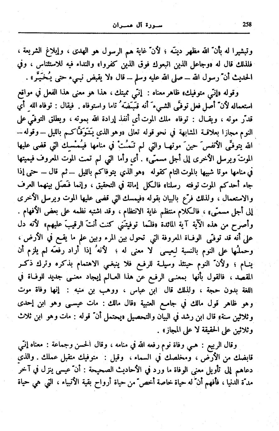 الْأَفْهَامِ. وَأَصْرَحُ مِنْ هَذِهِ الْآيَةِ آيَةُ الْمَائِدَةِ: «فَلَمَّا تَوَفَّيْتَنِي كُنْتَ أَنْتَ الرَّقِيبَ عَلَيْهِمْ» لِأَنَّهُ دَلَّ عَلَى أَنَّهُ قَدْ تُوُفِّيَ الْوَفَاةَ الْمَعْرُوفَةَ الَّتِي تَحُولُ بَيْنَ الْمَرْءِ وَبَيْنَ عِلْمِ مَا يَقَعُ فِي الْأَرْضِ، وَحَمْلُهَا عَلَى النَّوْمِ بِالنِّسْبَةِ لِعِيسَى لَا مَعْنَى لَهُ لِأَنَّهُ إِذَا أَرَادَ رَفْعَهُ لَمْ يَلْزَمْ أَنْ يَنَامَ وَلِأَنَّ النَّوْمَ حِينَئِذٍ وَسِيلَةٌ لِلرَّفْعِ فَلَا يَنْبَغِي الِاهْتِمَامُ بِذِكْرِهِ وَتَرْكُ ذِكْرِ الْمَقْصِدِ، فَالْقَوْلُ بِأَنَّهَا بِمَعْنَى الرَّفْعِ عَنْ هَذَا الْعَالَمِ إِيجَادُ مَعْنًى جَدِيدٍ لِلْوَفَاةِ فِي اللُّغَةِ بِدُونِ حُجَّةٍ، وَلِذَلِكَ قَالَ ابْنُ عَبَّاسٍ، وَوَهْبُ بْنُ مُنَبِّهٍ: إِنَّهَا وَفَاةُ مَوْتٍ وَهُوَ ظَاهِرُ قَوْلِ مَالِكٍ فِي جَامِعِ الْعُتْبِيَّةِ «قَالَ مَالِكٌ: مَاتَ عِيسَى وَهُوَ ابْنُ إِحْدَى وَثَلَاثِينَ سَنَةً» قَالَ ابْنُ رُشْدٍ فِي «الْبَيَانِ وَالتَّحْصِيلِ» :