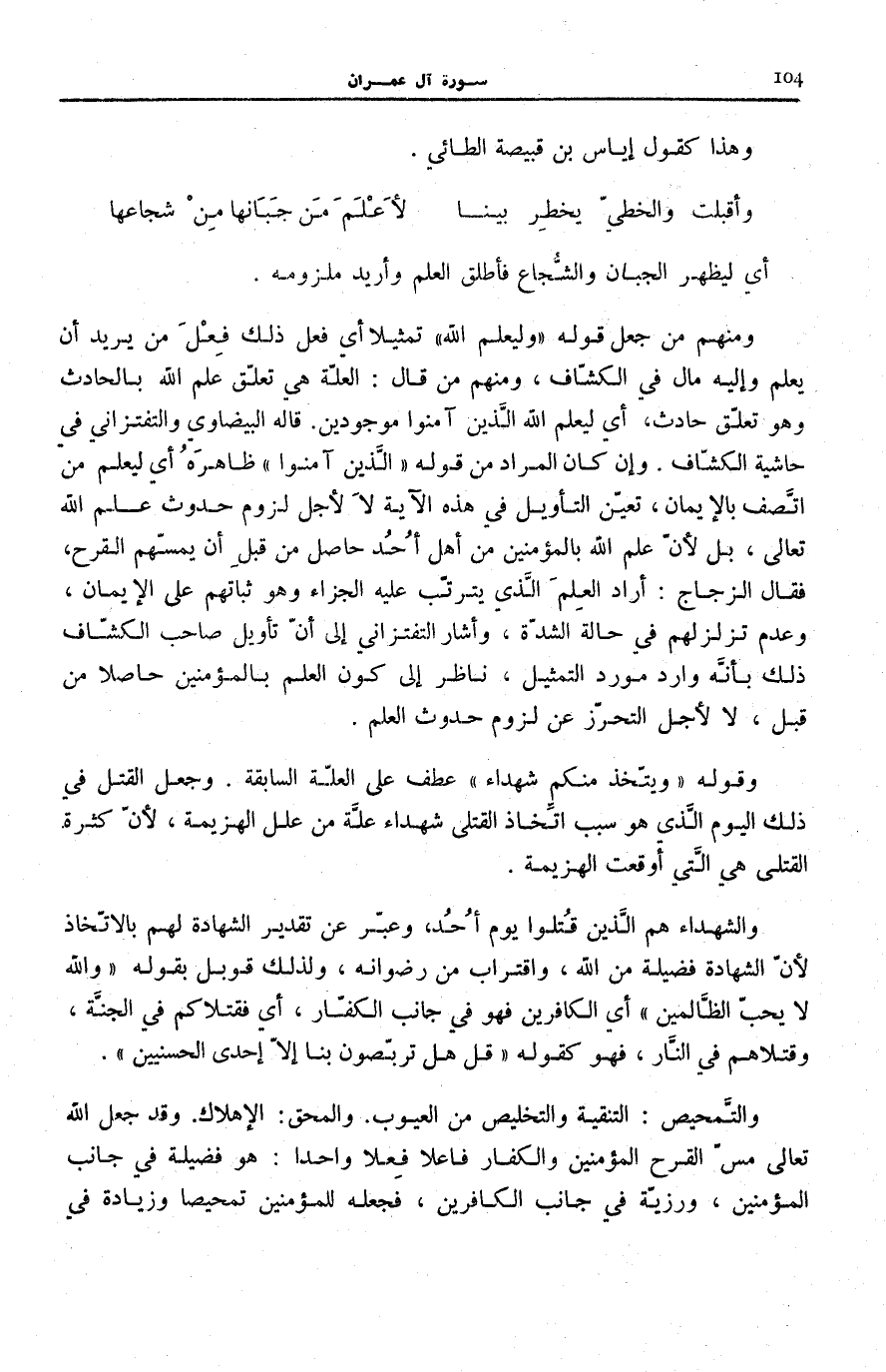 وَمِنْهُمْ مَنْ جَعَلَ قَوْلَهُ: وَلِيَعْلَمَ اللَّهُ تَمْثِيلًا أَيْ فِعْلُ ذَلِكَ فِعْلُ مَنْ يُرِيدُ أَنْ يَعْلَمَ وَإِلَيْهِ مَالَ فِي «الْكَشَّافِ» ، وَمِنْهُمْ مَنْ قَالَ: الْعِلَّةُ هِيَ تَعَلُّقُ عِلْمِ اللَّهِ بِالْحَادِثِ وَهُوَ تَعَلُّقٌ حَادِثٌ، أَيْ لِيَعْلَمَ اللَّهُ الَّذِينَ آمَنُوا مَوْجُودِينَ. قَالَه الْبَيْضَاوِيّ والتفتازانيّ فِي «حَاشِيَةِ الْكَشَّافِ» . وَإِنْ كَانَ الْمُرَادُ مِنْ قَوْلِهِ: الَّذِينَ آمَنُوا ظَاهِرُهُ أَيْ لِيَعْلَمَ مَنِ اتَّصَفَ بِالْإِيمَانِ، تَعَيَّنَ التَّأْوِيلَ فِي هَذِهِ الْآيَةِ لَا لِأَجْلِ لُزُومِ حُدُوثِ عِلْمِ اللَّهِ تَعَالَى، بَلْ لِأَنَّ عِلْمَ اللَّهِ بِالْمُؤْمِنِينَ مِنْ أَهْلِ أُحُدٍ حَاصِلٌ مِنْ قَبْلِ أَنْ يَمَسَّهُمُ الْقَرْحِ، فَقَالَ الزَّجَّاجُ: أَرَادَ الْعِلْمَ الَّذِي يَتَرَتَّبُ عَلَيْهِ الْجَزَاءُ وَهُوَ ثَبَاتُهُمْ عَلَى الْإِيمَانِ، وَعَدَمُ تزلزلهم فِي حَال الشدّة، وَأَشَارَ التفتازانيّ إِلَى أَنَّ تَأْوِيلَ صَاحِبِ «الْكَشَّافِ» ذَلِكَ بِأَنَّهُ وَارِدٌ مورد التَّمْثِيل، نَاظر إِلَى كَوْنِ الْعِلْمِ بِالْمُؤْمِنِينَ حَاصِلًا مِنْ قَبْلُ، لَا لِأَجْلِ التَّحَرُّزِ عَنْ لُزُومِ حُدُوثِ الْعِلْمِ.