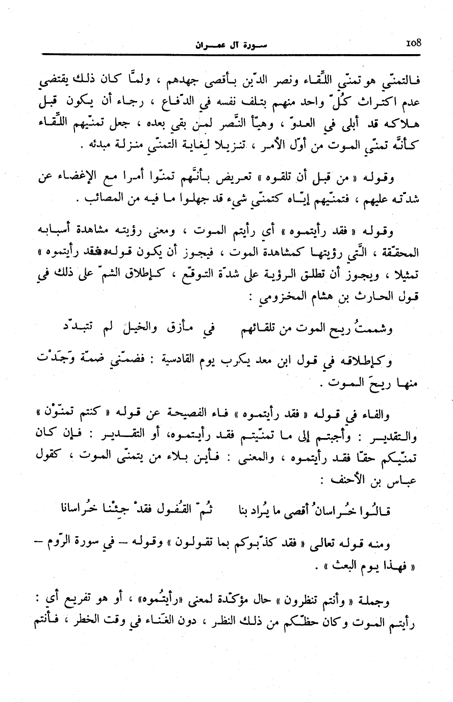وَأُجِبْتُمْ إِلَى مَا تَمَنَّيْتُمْ فقد رَأَيْتُمُوهُ، أَو التَّقْدِير: فَإِن كَانَ تمنّيكم حقّا فَقَدْ رَأَيْتُمُوهُ، وَالْمَعْنَى: فَأَيْنَ بَلَاءُ مَنْ يَتَمَنَّى الْمَوْتَ، كَقَوْلِ عَبَّاسِ بْنِ الْأَحْنَفِ: