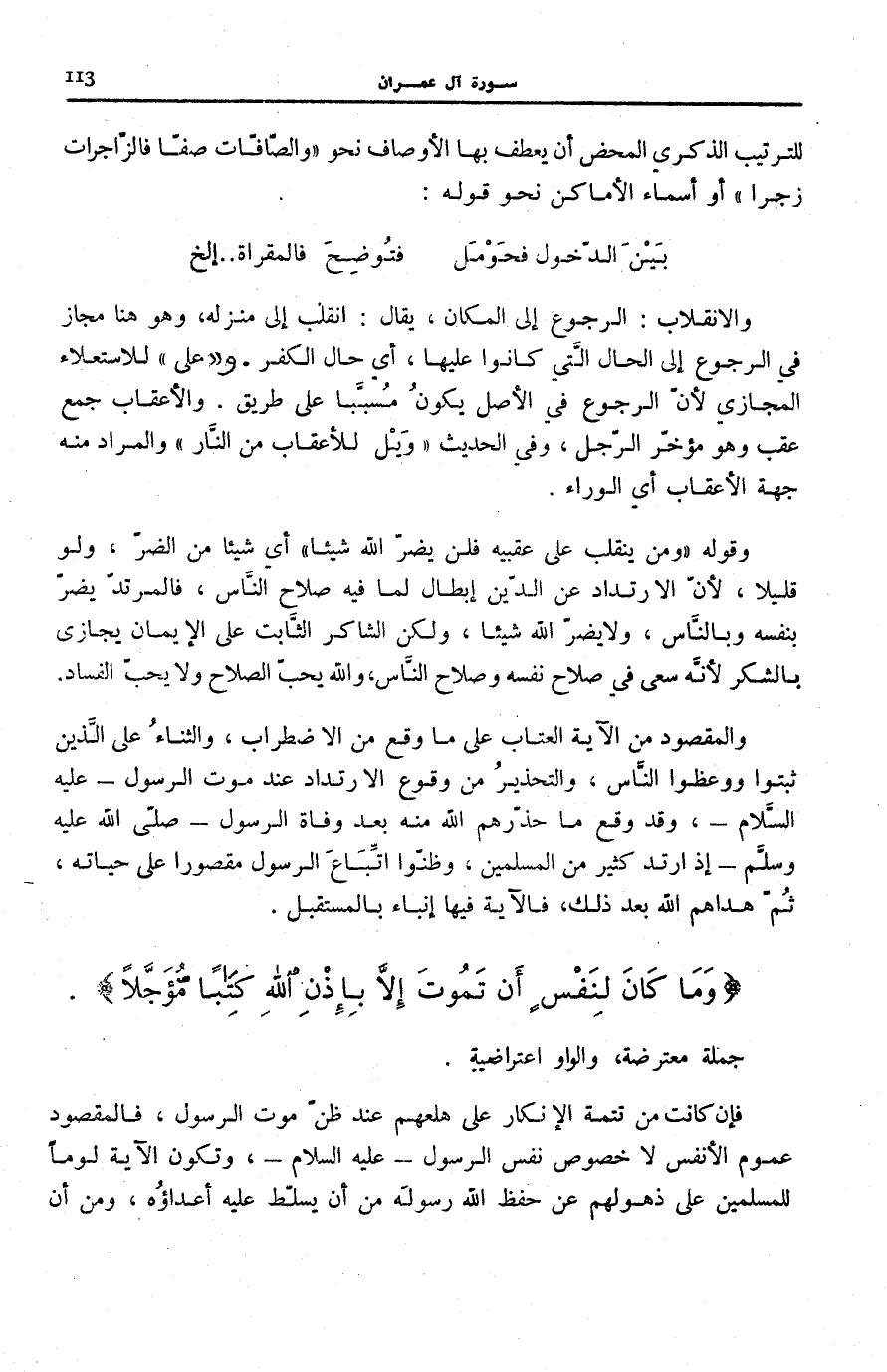 وَما كانَ لِنَفْسٍ أَنْ تَمُوتَ إِلاَّ بِإِذْنِ اللَّهِ كِتاباً مُؤَجَّلاً وَمَنْ يُرِدْ ثَوابَ الدُّنْيا نُؤْتِهِ مِنْها وَمَنْ يُرِدْ ثَوابَ الْآخِرَةِ نُؤْتِهِ مِنْها وَسَنَجْزِي الشَّاكِرِينَ (145)