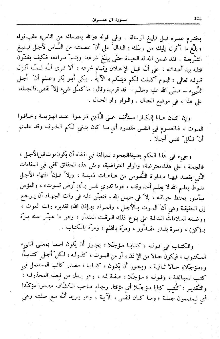 فَالْجُمْلَةُ، عَلَى هَذَا، مُعْتَرِضَةٌ، وَالْوَاوُ اعْتِرَاضِيَّةٌ، وَمِثْلُ هَذِهِ الْحَقَائِقِ تُلْقَى فِي الْمَقَامَاتِ الَّتِي يُقْصَدُ فِيهَا مُدَاوَاةُ النُّفُوسِ مِنْ عَاهَاتٍ ذَمِيمَةٍ، وَإِلَّا فَإِنَّ انْتِهَاءَ الْأَجَلِ مَنُوطٌ بِعِلْمِ اللَّهِ لَا يَعْلَمُ أَحَدٌ وَقْتَهُ، وَما تَدْرِي نَفْسٌ بِأَيِّ أَرْضٍ تَمُوتُ [لُقْمَان: 34] ، وَالْمُؤْمِنُ مَأْمُورٌ بِحِفْظِ حَيَاتِهِ، إِلَّا فِي سَبِيل الله، فتعيّن عَلَيْهِ فِي وَقْتِ الْجِهَادِ أَنْ يَرْجِعَ إِلَى الْحَقِيقَةِ وَهِيَ أَنَّ الْمَوْتَ بِالْأَجَلِ، وَالْمُرَادُ بِإِذْنِ اللَّهِ تَقْدِيرُهُ وَقْتَ الْمَوْتِ، وَوَضْعُهُ الْعَلَامَاتِ الدَّالَّةِ عَلَى بُلُوغِ ذَلِكَ الْوَقْتِ الْمُقَدَّرِ، وَهُوَ مَا عَبَّرَ عَنْهُ مَرَّةً بِ (كُنْ) ، وَمَرَّةً بِقَدَرٍ مَقْدُورٍ، وَمَرَّةً بِالْقَلَمِ، وَمَرَّةً بِالْكِتَابِ.