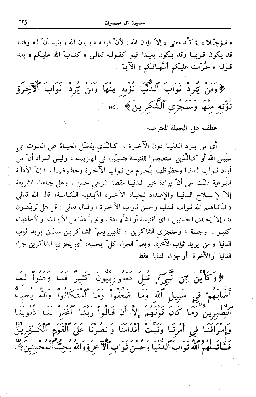 148] وَقَالَ تَعَالَى: قُلْ هَلْ تَرَبَّصُونَ بِنا إِلَّا إِحْدَى الْحُسْنَيَيْنِ أَيِ الْغَنِيمَةَ أَوِ الشَّهَادَةَ، وَغَيْرُ هَذَا مِنَ الْآيَاتِ وَالْأَحَادِيثِ كَثِيرٌ. وَجُمْلَةُ وَسَنَجْزِي الشَّاكِرِينَ تَذْيِيلٌ يَعُمُّ الشَّاكِرِينَ مِمَّنْ يُرِيدُ ثَوَابَ الدُّنْيَا وَمَنْ يُرِيدُ ثَوَابَ الْآخِرَةِ. وَيَعُمُّ الْجَزَاءَ كُلٌّ بِحَسْبِهِ، أَيْ يَجْزِي الشَّاكِرِينَ جَزَاءَ الدُّنْيَا وَالْآخِرَةِ أَوْ جَزَاءَ الدُّنْيَا فَقَط.