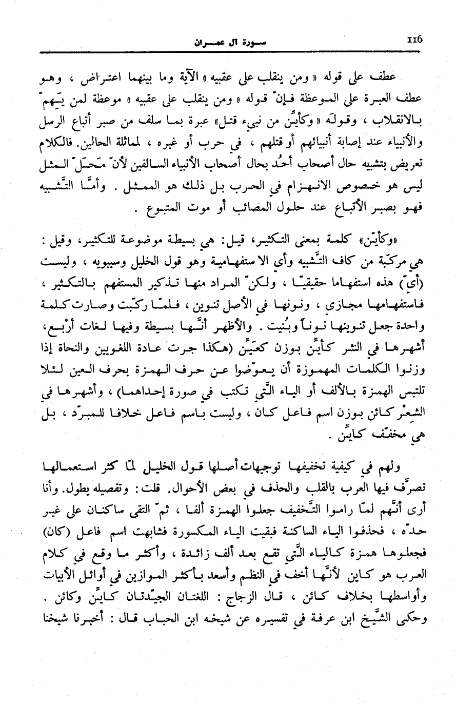 عَطْفٌ عَلَى قَوْلِهِ: وَمَنْ يَنْقَلِبْ عَلى عَقِبَيْهِ [آل عمرَان: 144] الْآيَةَ وَمَا بَيْنَهُمَا اعْتِرَاضٌ، وَهُوَ عَطْفُ الْعِبْرَةِ عَلَى الْمَوْعِظَةِ فَإِنَّ قَوْلَهُ: وَمَنْ يَنْقَلِبْ عَلى عَقِبَيْهِ مَوْعِظَةٌ لِمَنْ يَهُمُّ بِالِانْقِلَابِ، وَقَوْلَهُ: وَكَأَيِّنْ مِنْ نَبِيٍّ قاتَلَ عِبْرَةٌ بِمَا سَلَفَ مِنْ صَبْرِ أَتْبَاعِ الرُّسُلِ وَالْأَنْبِيَاءِ عِنْدَ إِصَابَةِ أَنْبِيَائِهِمْ أَوْ قَتْلِهِمْ، فِي حَرْبٍ أَوْ غَيْرِهِ، لِمُمَاثَلَةِ الْحَالَيْنِ. فَالْكَلَامُ تَعْرِيضٌ بِتَشْبِيهِ حَالِ أَصْحَابِ أُحُدٍ بِحَالِ أَصْحَابِ الْأَنْبِيَاءِ السَّالِفِينَ لِأَنَّ مَحَلَّ الْمَثَلِ لَيْسَ هُوَ خُصُوصُ الِانْهِزَامِ فِي الْحَرْبِ بَلْ ذَلِكَ هُوَ الْمُمَثَّلُ. وَأَمَّا التّشبيه فَهُوَ بَصِير الْأَتْبَاعِ عِنْدَ حُلُولِ الْمَصَائِبِ أَوْ مَوْتِ الْمَتْبُوعِ.