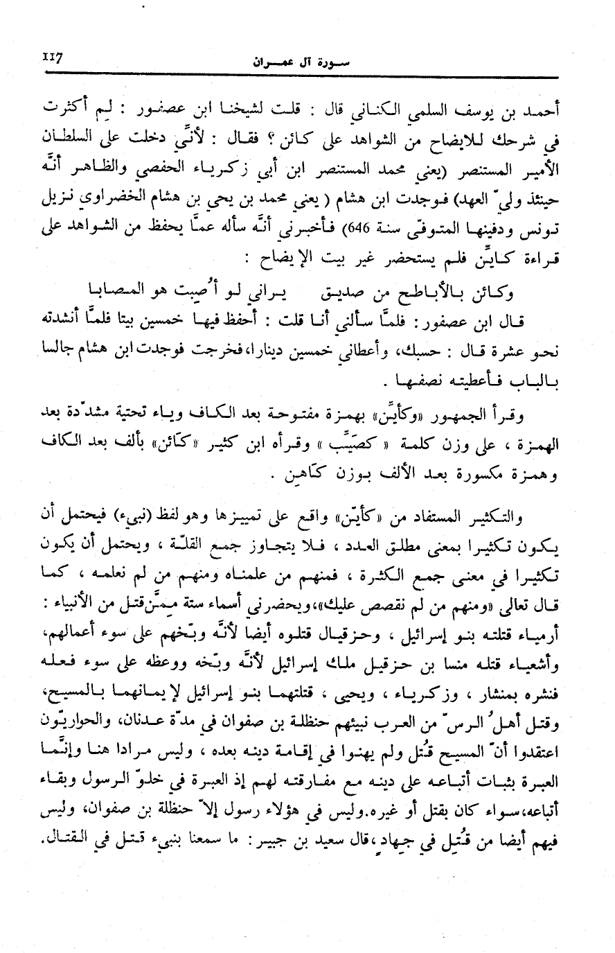 يُوسُفَ السُّلَمِيُّ الْكِنَانِيُّ، قَالَ: قُلْتُ لِشَيْخِنَا ابْنِ عُصْفُورٍ: لِمَ أَكْثَرْتَ فِي شَرْحِكَ لِلْإِيضَاحِ مِنَ الشَّوَاهِدِ عَلَى كَائِنٍ؟ فَقَالَ: لِأَنِّي دَخَلْتُ عَلَى السُّلْطَانِ الْأَمِيرِ الْمُسْتَنْصِرِ (يَعْنِي مُحَمَّدَ الْمُسْتَنْصِرَ ابْنَ أَبِي زَكَرِيَّاءَ الْحَفْصِيَّ وَالظَّاهِرُ أَنَّهُ حِينَئِذٍ وَلِيُّ الْعَهْدِ) فَوَجَدْتُ ابْنَ هِشَامٍ (يَعْنِي مُحَمَّدَ بْنَ يَحْيَى بْنِ هِشَامٍ الْخَضْرَاوِيَّ نَزِيلَ تُونُسَ وَدَفِينَهَا الْمُتَوَفَّى سَنَةَ 646) فَأَخْبَرَنِي أَنَّهُ سَأَلَهُ عَمَّا يَحْفَظُ مِنَ الشَّوَاهِدِ عَلَى قِرَاءَةِ كَأَيِّنْ فَلَمْ يَسْتَحْضِرْ غَيْرَ بَيْتِ الْإِيضَاحِ: