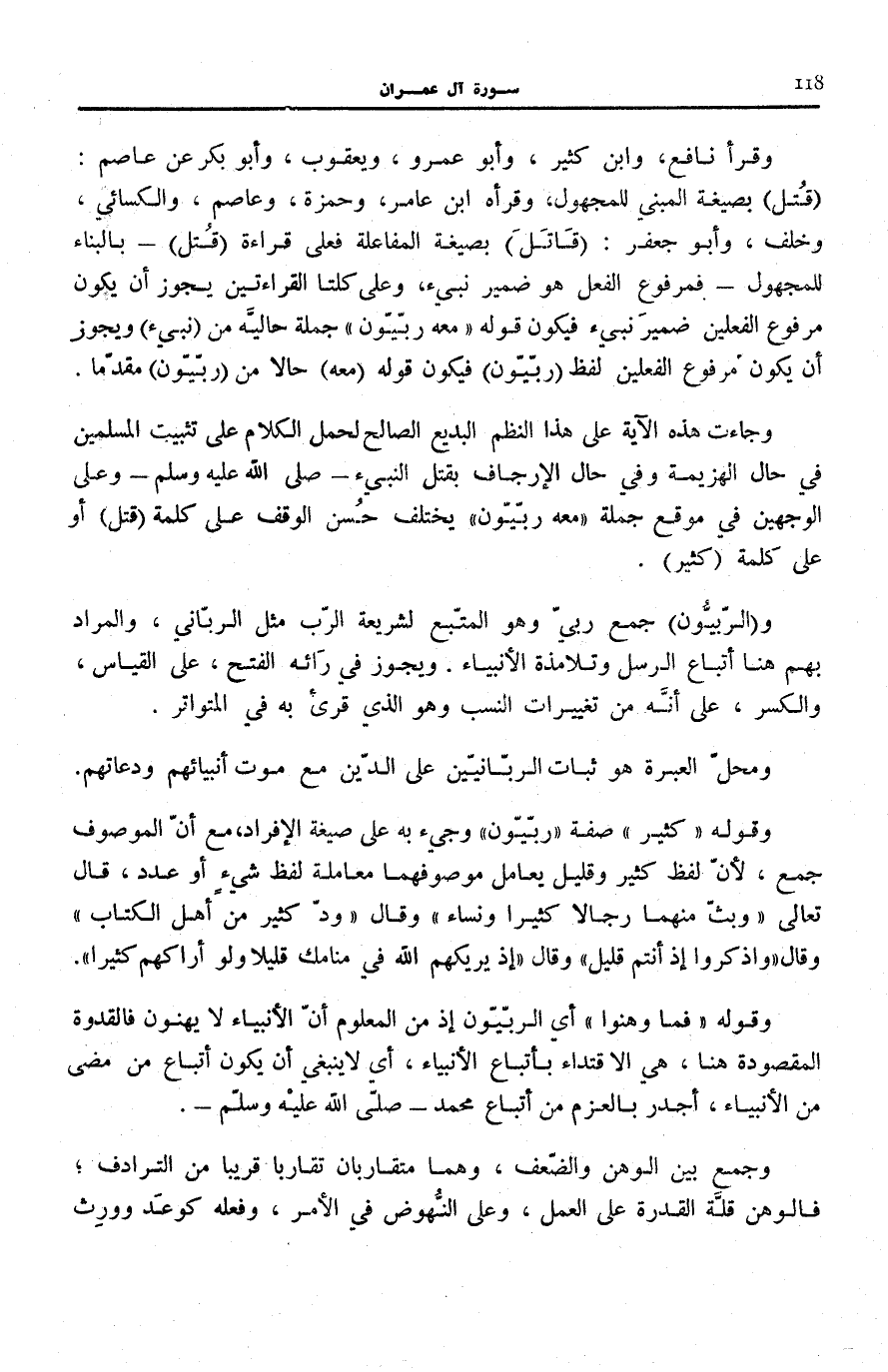 وَجَاءَتْ هَذِهِ الْآيَةُ عَلَى هَذَا النَّظْمِ الْبَدِيعِ الصَّالِحِ لِحَمْلِ الْكَلَامِ عَلَى تَثْبِيتِ الْمُسْلِمِينَ فِي حَالِ الْهَزِيمَةِ وَفِي حَالِ الْإِرْجَافِ بِقَتْلِ النَّبِيءِ صَلَّى اللهُ عَلَيْهِ وَسَلَّمَ وَعَلَى الْوَجْهَيْنِ فِي مَوْقِعِ جُمْلَةِ مَعَهُ رِبِّيُّونَ يَخْتَلِفُ حُسْنُ الْوَقْفِ عَلَى كَلِمَةِ (قُتِلَ) أَوْ عَلَى كلمة (كثير) .