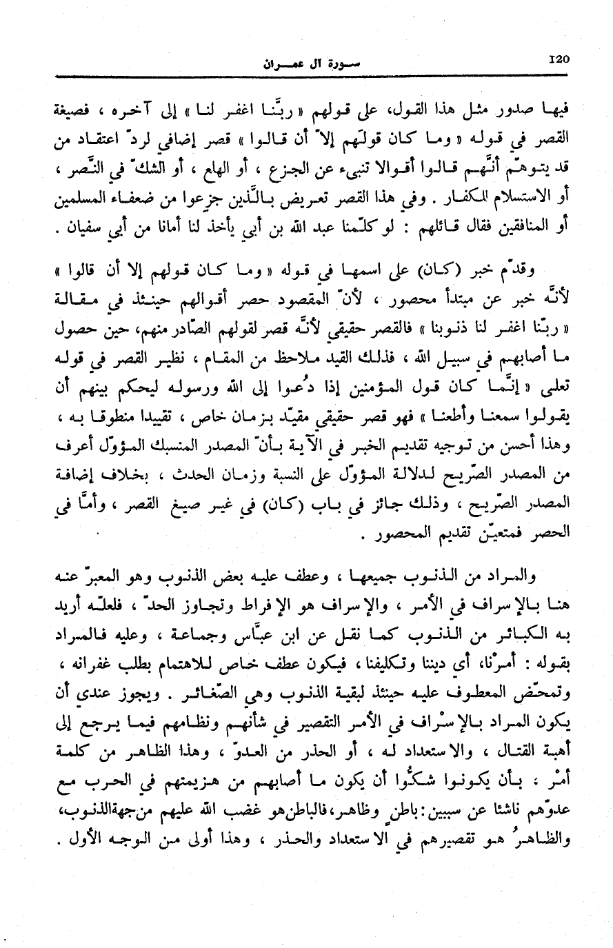 فِيهَا صُدُورُ مِثْلِ هَذَا الْقَوْلِ، عَلَى قَوْلِهِمْ: رَبَّنَا اغْفِرْ لَنا إِلَى آخِرِهِ، فَصِيغَةُ الْقَصْرِ فِي قَوْلِهِ: وَما كانَ قَوْلَهُمْ إِلَّا أَنْ قالُوا قَصْرٌ إِضَافِيٌّ لِرَدِّ اعْتِقَادِ مَنْ قَدْ يَتَوَهَّمُ أَنَّهُمْ قَالُوا أقوالا تنبىء عَنِ الْجَزَعِ، أَوِ الْهَلَعِ، أَوِ الشَّكِّ فِي النَّصْرِ، أَوِ الِاسْتِسْلَامِ لِلْكُفَّارِ. وَفِي هَذَا الْقَصْرِ تَعْرِيضٌ بِالَّذِينَ جَزِعُوا مِنْ ضُعَفَاءِ الْمُسْلِمِينَ أَوِ الْمُنَافِقِينَ فَقَالَ قَائِلُهُمْ: لَوْ كَلَّمْنَا عَبْدَ اللَّهِ بْنَ أُبَيٍّ يَأْخُذُ لَنَا أَمَانًا مِنْ أَبِي سُفْيَانَ.