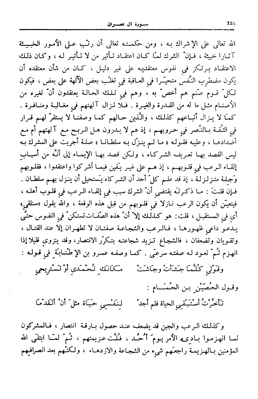 لِغَيْرِهِ مِنَ الْأَصْنَامِ مِثْلُ مَا لَهُ مِنَ الْقُدْرَةِ وَالْغَيْرَةِ. فَلَا تَزَالُ آلِهَتُهُمْ فِي مُغَالَبَةٍ وَمُنَافَرَةٍ. كَمَا لَا يَزَالُ أَتْبَاعُهُمْ كَذَلِكَ، وَالَّذِينَ حَالُهُمْ كَمَا وَصَفْنَا لَا يَسْتَقِرُّ لَهُمْ قَرَارٌ فِي الثِّقَةِ بِالنَّصْرِ فِي حُرُوبِهِمْ، إِذْ هُمْ لَا يَدْرُونَ هَلِ الرِّبْحُ مَعَ آلِهَتِهِمْ أَمْ مَعَ أَضْدَادِهَا، وَعَلَيْهِ فَقَوْلُهُ: مَا لَمْ يُنَزِّلْ بِهِ سُلْطاناً صِلَةٌ أُجْرِيَتْ عَلَى الْمُشْرِكِ بِهِ لَيْسَ الْقَصْدُ بِهَا تَعْرِيفُ الشُّرَكَاءِ، وَلَكِنْ قُصِدَ بِهَا الْإِيمَاءُ إِلَى أَنَّهُ مِنْ أَسْبَابِ إِلْقَاءِ الرُّعْبِ فِي قُلُوبِهِمْ، إِذْ هُمْ عَلَى غَيْرِ يَقِينٍ فِيمَا أَشْرَكُوا وَاعْتَقَدُوا، فَقُلُوبُهُمْ وَجِلَةٌ مُتَزَلْزِلَةٌ، إِذْ قَدْ عَلِمَ كُلُّ أَحَدٍ أَنَّ الشُّرَكَاءَ يَسْتَحِيلُ أَنْ يَنْزِلَ بِهِمْ سُلْطَانٌ. فَإِنْ قُلْتَ: مَا ذَكَرْتَهُ يَقْتَضِي أَنَّ الشِّرْكَ سَبَبٌ فِي إِلْقَاءِ الرُّعْبِ فِي قُلُوبِ أَهْلِهِ، فَيَتَعَيَّنُ أَنْ يَكُونَ الرُّعْبُ نَازِلًا فِي قُلُوبِهِمْ مِنْ قَبْلِ هَذِهِ الْوَقْعَةِ، وَاللَّهُ يَقُولُ سَنُلْقِي» أَيْ فِي الْمُسْتَقْبَلِ، قُلْتُ: هُوَ كَذَلِكَ إِلَّا أَنَّ هَذِهِ الصِّفَاتِ تَسْتَكِنُّ فِي النُّفُوسِ حَتَّى يَدْعُوَ دَاعِي ظُهُورِهَا، فَالرُّعْبُ وَالشَّجَاعَةُ صِفَتَانِ لَا تَظْهَرَانِ إِلَّا عِنْدَ الْقِتَالِ، وَتَقْوَيَانِ وَتَضْعُفَانِ، فَالشُّجَاعُ تَزِيدُ شَجَاعَتُهُ بِتَكَرُّرِ الِانْتِصَارِ، وَقَدْ يَنْزَوِي قَلِيلًا إِذَا انْهَزَمَ ثُمَّ تَعُودُ لَهُ صِفَتُهُ سَرْعَى. كَمَا وَصَفَهُ عَمْرُو بْنُ الْإِطْنَابَةَ فِي قَوْلِهِ: