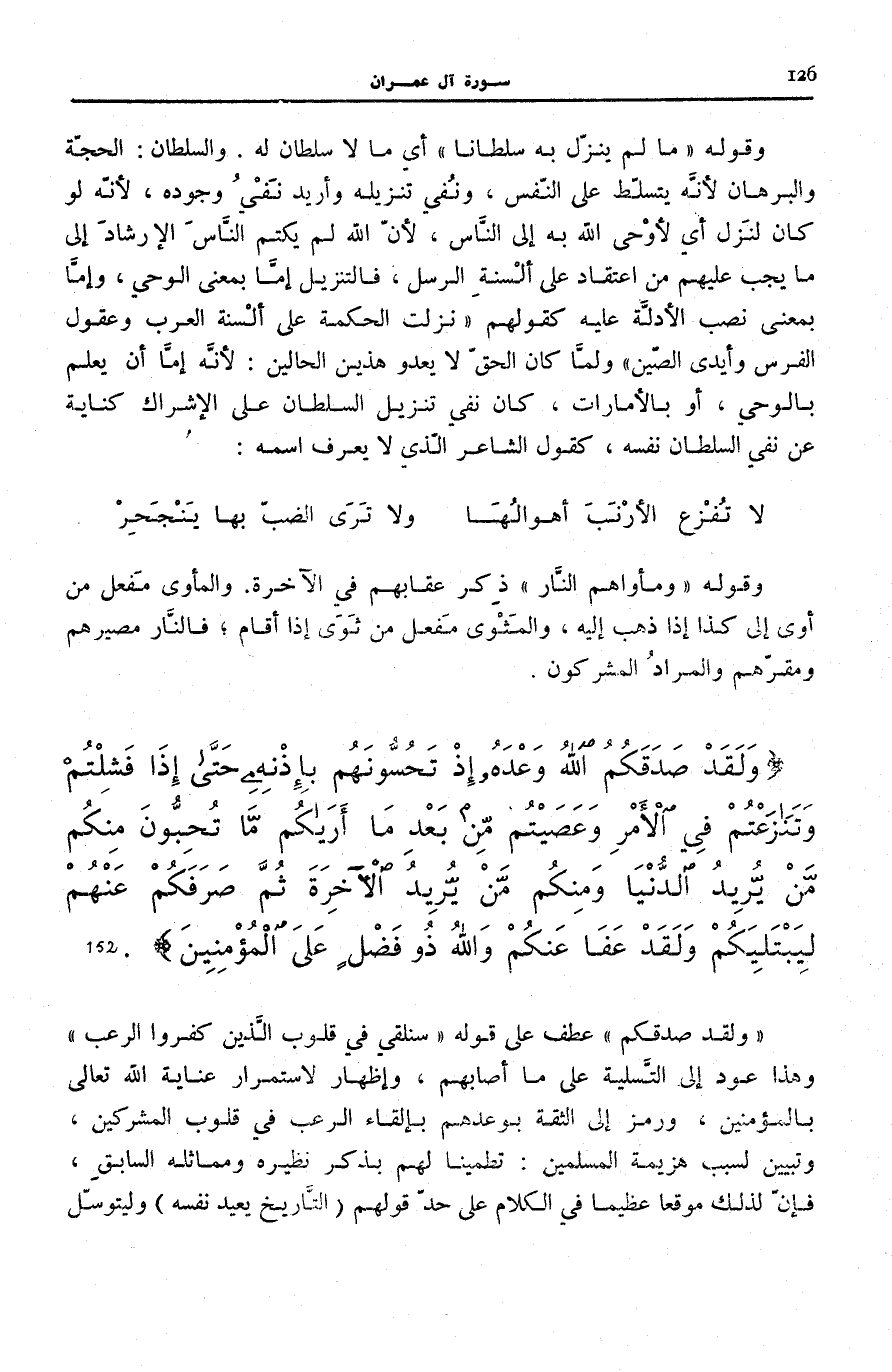 وَقَوْلُهُ: مَا لَمْ يُنَزِّلْ بِهِ سُلْطاناً أَيْ مَا لَا سُلْطَانَ لَهُ. وَالسُّلْطَانُ: الْحُجَّةُ وَالْبُرْهَانُ لِأَنَّهُ يَتَسَلَّطُ عَلَى النَّفْسِ، وَنُفِيَ تَنْزِيلُهُ وَأُرِيدَ نَفْيُ وَجُودِهِ، لِأَنَّهُ لَوْ كَانَ لِنَزَلَ أَيْ لَأَوْحَى اللَّهُ بِهِ إِلَى النَّاسِ، لِأَنَّ اللَّهَ لَمْ يَكْتُمِ النَّاسَ الْإِرْشَادَ إِلَى مَا يَجِبُ عَلَيْهِمْ مِنِ اعْتِقَادٍ عَلَى أَلْسِنَةِ الرُّسُلِ، فَالتَّنْزِيلُ إِمَّا بِمَعْنَى الْوَحْيِ، وَإِمَّا بِمَعْنَى نصب الأدلّة عَلَيْهِم كَقَوْلِهِمْ: «نَزَلَتِ الْحِكْمَةُ عَلَى أَلْسِنَةِ الْعَرَبِ وَعُقُولِ الْفُرْسِ وَأَيْدِي الصِّينِ» وَلَمَّا كَانَ الْحَقُّ لَا يَعْدُو هَذَيْنِ الْحَالَيْنِ: لِأَنَّهُ إِمَّا أَنْ يُعْلَمَ بِالْوَحْيِ، أَوْ بِالْأَمَارَاتِ، كَانَ نَفْيُ تَنْزِيلِ السُّلْطَانِ عَلَى الْإِشْرَاكِ كِنَايَةً عَنْ نَفْيِ السُّلْطَانِ نَفْسِهِ، كَقَوْلِ الشَّاعِرِ الَّذِي لَا يُعْرَفُ اسْمُهُ: