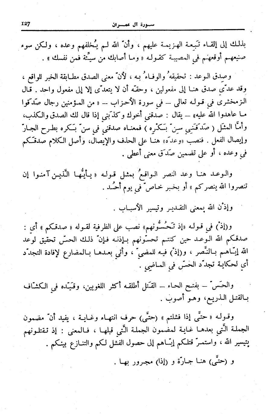 و (إِذْ) فِي قَوْلِهِ: إِذْ تَحُسُّونَهُمْ نَصْبٌ عَلَى الظَّرْفِيَّةِ لِقَوْلِهِ: صَدَقَكُمُ أَيْ: صَدَقَكُمُ اللَّهُ الْوَعْدَ حِينَ كُنْتُمْ تَحُسُّونَهُمْ بِإِذْنِهِ فَإِنَّ ذَلِكَ الْحِسَّ تَحْقِيقٌ لِوَعْدِ اللَّهِ إيّاهم بالنّصر، و (إِذْ) فِيهِ لِلْمُضِيِّ، وَأُتِيَ بَعْدَهَا بِالْمُضَارِعِ لِإِفَادَةِ التَّجَدُّدِ أَيْ لِحِكَايَةِ تَجَدُّدِ الْحَسِّ فِي الْمَاضِي.