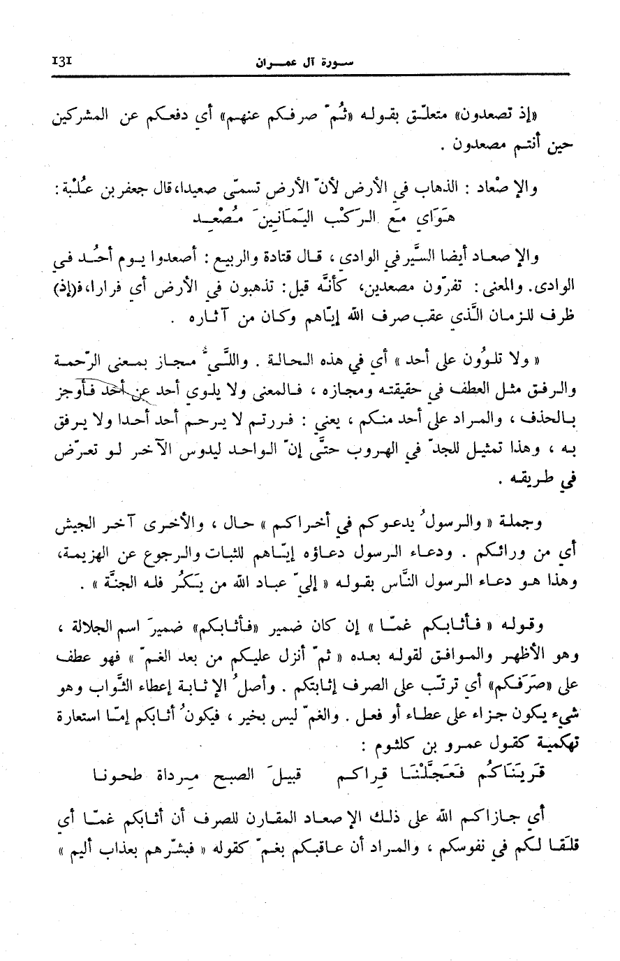 وَالْمَعْنَى: تَفِرُّونَ مُصْعِدِينَ، كَأَنَّهُ قِيلَ: تَذْهَبُونَ فِي الْأَرْضِ أَي فِرَارًا، ف إِذْ) ظَرْفٌ لِلزَّمَانِ الَّذِي عَقِبَ صَرْفَ اللَّهِ إِيَّاهُمْ وَكَانَ مِنْ آثَارِهِ.