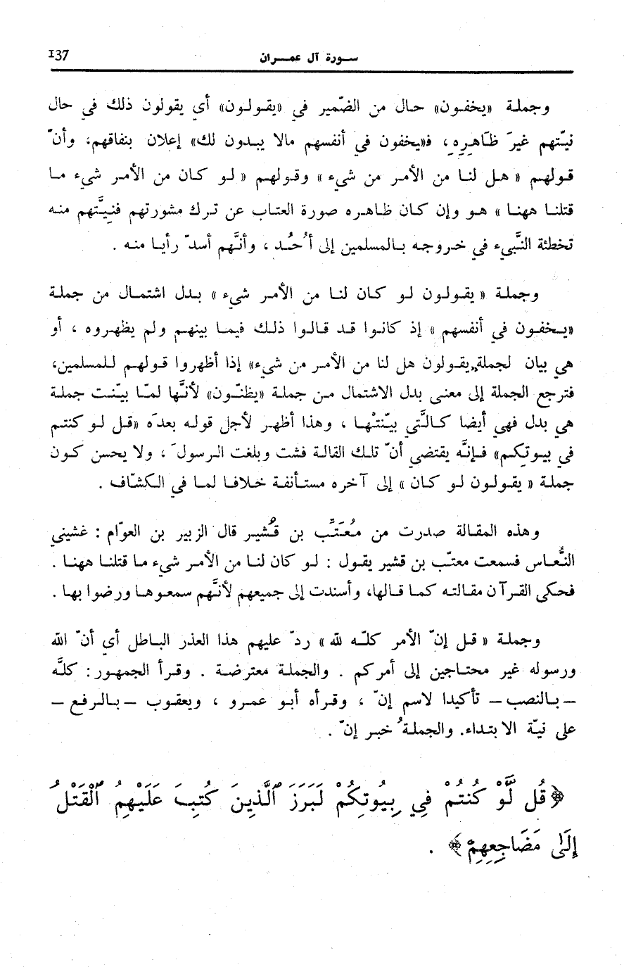 وَجُمْلَةُ يَقُولُونَ لَوْ كانَ لَنا مِنَ الْأَمْرِ شَيْءٌ بَدَلُ اشْتِمَالٍ مِنْ جُمْلَةِ يُخْفُونَ فِي أَنْفُسِهِمْ إِذْ كَانُوا قَدْ قَالُوا ذَلِكَ فِيمَا بَيْنَهُمْ وَلَمْ يُظْهِرُوهُ، أَوْ هِيَ بَيَانٌ لِجُمْلَةِ يَقُولُونَ هَلْ لَنا مِنَ الْأَمْرِ مِنْ شَيْءٍ إِذَا أَظْهَرُوا قَوْلَهُمْ لِلْمُسْلِمِينَ، فَتَرْجِعُ الْجُمْلَةُ إِلَى مَعْنَى بَدَلِ الِاشْتِمَالِ مِنْ جُمْلَةِ يَظُنُّونَ لِأَنَّهَا لَمَّا بَيَّنَتْ جُمْلَةَ هِيَ بَدَلٌ فَهِيَ أَيْضًا كَالَّتِي بَيَّنَتْهَا، وَهَذَا أَظْهَرُ لِأَجْلِ قَوْلِهِ بَعْدَهُ: قُلْ لَوْ كُنْتُمْ فِي بُيُوتِكُمْ فَإِنَّهُ يَقْتَضِي أَنَّ تِلْكَ الْقَالَةَ فَشَتْ وَبَلَغَتِ الرَّسُولَ، وَلَا يَحْسُنُ كَوْنُ جُمْلَةِ يَقُولُونَ لَوْ كانَ إِلَى آخِرِهِ مُسْتَأْنَفَةً خِلَافًا لِمَا فِي «الْكَشَّافِ» .