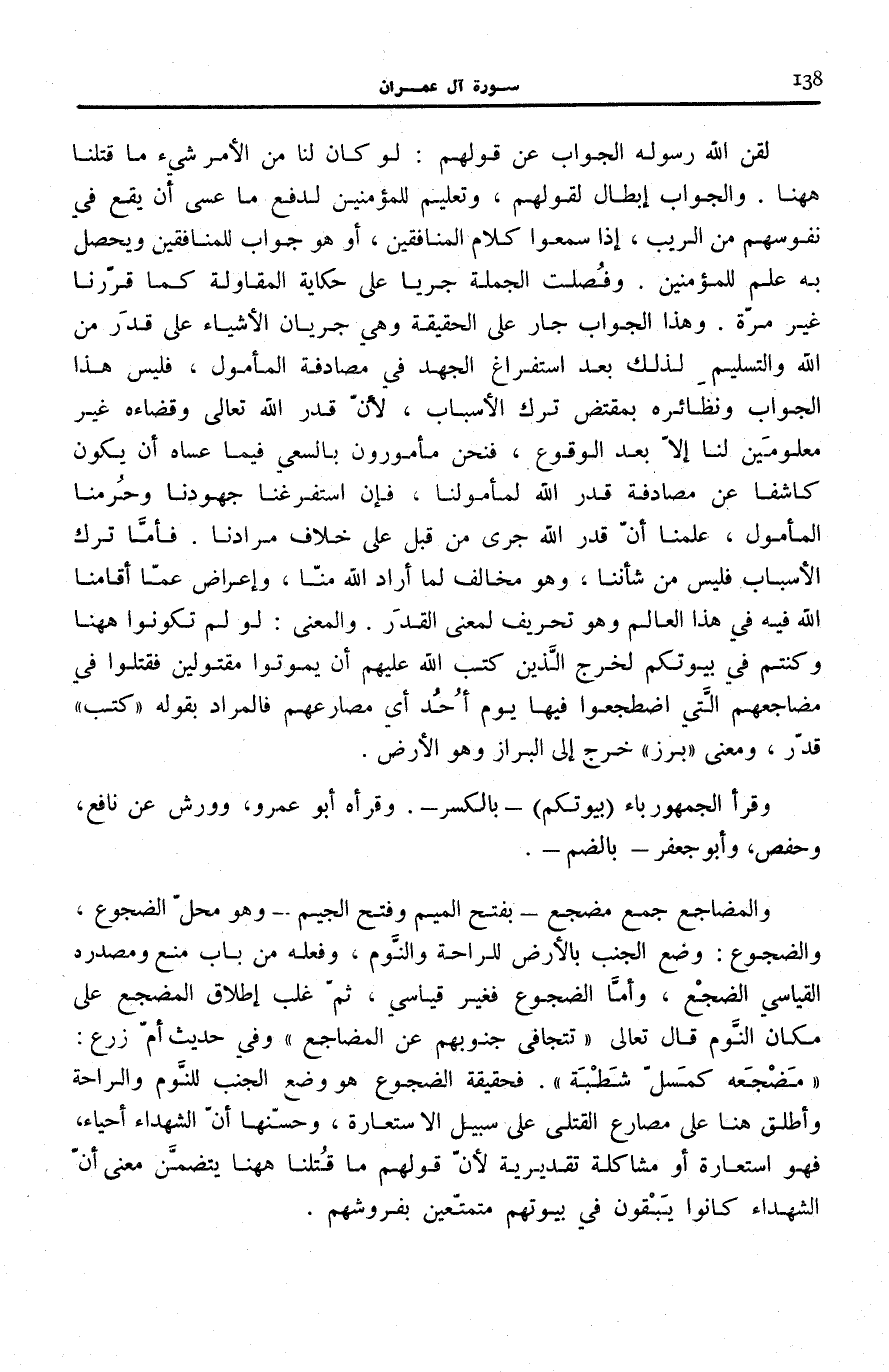 وَالْجَوَابُ إِبْطَالٌ لِقَوْلِهِمْ، وَتَعْلِيمٌ لِلْمُؤْمِنِينَ لِدَفْعِ مَا عَسَى أَنْ يَقَعَ فِي نُفُوسِهِمْ مِنَ الرَّيْبِ، إِذَا سَمِعُوا كَلَامَ الْمُنَافِقِينَ، أَوْ هُوَ جَوَابٌ لِلْمُنَافِقِينَ وَيَحْصُلُ بِهِ عِلْمٌ لِلْمُؤْمِنِينَ. وَفُصِلَتِ الْجُمْلَةُ جَرْيًا عَلَى حِكَايَةِ الْمُقَاوَلَةِ كَمَا قَرَّرْنَا غَيْرَ مَرَّةٍ. وَهَذَا الْجَوَابُ جَارٍ عَلَى الْحَقِيقَةِ وَهِيَ جَرَيَانُ الْأَشْيَاءِ عَلَى قَدَرٍ مِنَ اللَّهِ وَالتَّسْلِيمُ لِذَلِكَ بَعْدَ اسْتِفْرَاغِ الْجُهْدِ فِي مُصَادَفَةِ الْمَأْمُولِ، فَلَيْسَ هَذَا الْجَوَابُ وَنَظَائِرُهُ بِمُقْتَضٍ تَرْكَ الْأَسْبَابِ، لِأَنَّ قَدَرَ اللَّهِ تَعَالَى وَقَضَاءَهُ غَيْرُ مَعْلُومَيْنِ لَنَا إِلَّا بَعْدَ الْوُقُوعِ، فَنَحْنُ مَأْمُورُونَ بِالسَّعْيِ فِيمَا عَسَاهُ أَنْ يَكُونَ كَاشِفًا عَنْ مُصَادَفَةِ قدر اللَّهِ لِمَأْمُولِنَا، فَإِنِ اسْتَفْرَغْنَا جُهُودَنَا وَحُرِمْنَا الْمَأْمُولَ، عَلِمْنَا أَنَّ قَدَرَ اللَّهِ جَرَى مِنْ قَبْلُ عَلَى خِلَافِ مُرَادِنَا. فَأَمَّا تَرْكُ الْأَسْبَابِ فَلَيْسَ مِنْ شَأْنِنَا، وَهُوَ مُخَالِفٌ لِمَا أَرَادَ اللَّهُ مِنَّا، وَإِعْرَاضٌ عَمَّا أَقَامَنَا اللَّهُ فِيهِ فِي هَذَا الْعَالَمِ وَهُوَ تَحْرِيفٌ لِمَعْنَى الْقَدَرِ. وَالْمَعْنَى: لَوْ لَمْ تَكُونُوا هَاهُنَا وَكُنْتُمْ فِي بُيُوتِكُمْ لَخَرَجَ الَّذِينَ كَتَبَ اللَّهُ عَلَيْهِمْ أَنْ يَمُوتُوا مَقْتُولِينَ فَقُتِلُوا فِي مَضَاجِعِهِمُ الَّتِي اضْطَجَعُوا فِيهَا يَوْمَ أُحُدٍ أَيْ مَصَارِعِهِمْ فَالْمُرَادُ بِقَوْلِهِ: كُتِبَ قدّر، وَمعنى لَبَرَزَ خَرَجَ إِلَى الْبَرَازِ وَهُوَ الْأَرْضُ.