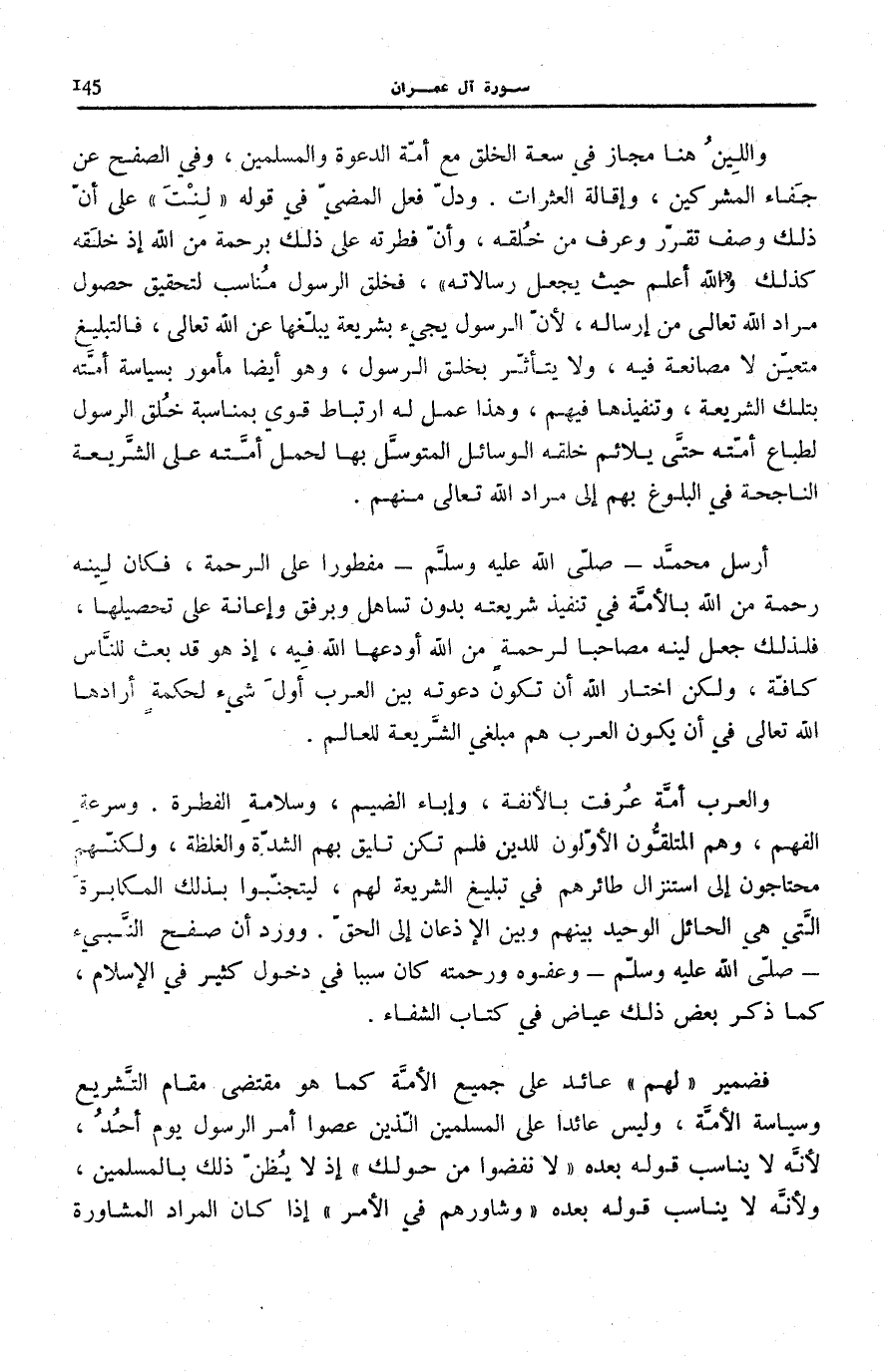 وَاللِّينُ هُنَا مَجَازٌ فِي سِعَةِ الْخَلْقِ مَعَ أُمَّةِ الدَّعْوَةِ وَالْمُسْلِمِينَ، وَفِي الصَّفْحِ عَنْ جَفَاءِ الْمُشْرِكِينَ، وَإِقَالَةِ الْعَثَرَاتِ. وَدَلَّ فِعْلُ الْمُضِيِّ فِي قَوْلِهِ: لِنْتَ عَلَى أَنَّ ذَلِكَ وَصْفٌ تَقَرَّرَ وَعُرِفَ مِنْ خُلُقِهِ، وَأَنَّ فِطْرَتَهُ عَلَى ذَلِكَ بِرَحْمَةٍ مِنَ اللَّهِ إِذْ خَلَقَهُ كَذَلِكَ واللَّهُ أَعْلَمُ حَيْثُ يَجْعَلُ رِسالَتَهُ [الْأَنْعَام: 124] ، فَخُلُقُ الرَّسُولِ مُنَاسِبٌ لِتَحْقِيقِ حُصُولِ مُرَادِ اللَّهِ تَعَالَى مِنْ إِرْسَالِهِ، لِأَنَّ الرَّسُولَ يَجِيءُ بِشَرِيعَةٍ يُبَلِّغُهَا عَنِ اللَّهِ تَعَالَى، فَالتَّبْلِيغُ مُتَعَيَّنٌ لَا مُصَانَعَةَ فِيهِ، وَلَا يَتَأَثَّرُ بِخُلُقِ الرَّسُولِ، وَهُوَ أَيْضًا مَأْمُورٌ بِسِيَاسَةِ أُمَّتِهِ بِتِلْكَ الشَّرِيعَةِ، وَتَنْفِيذِهَا فِيهِمْ،