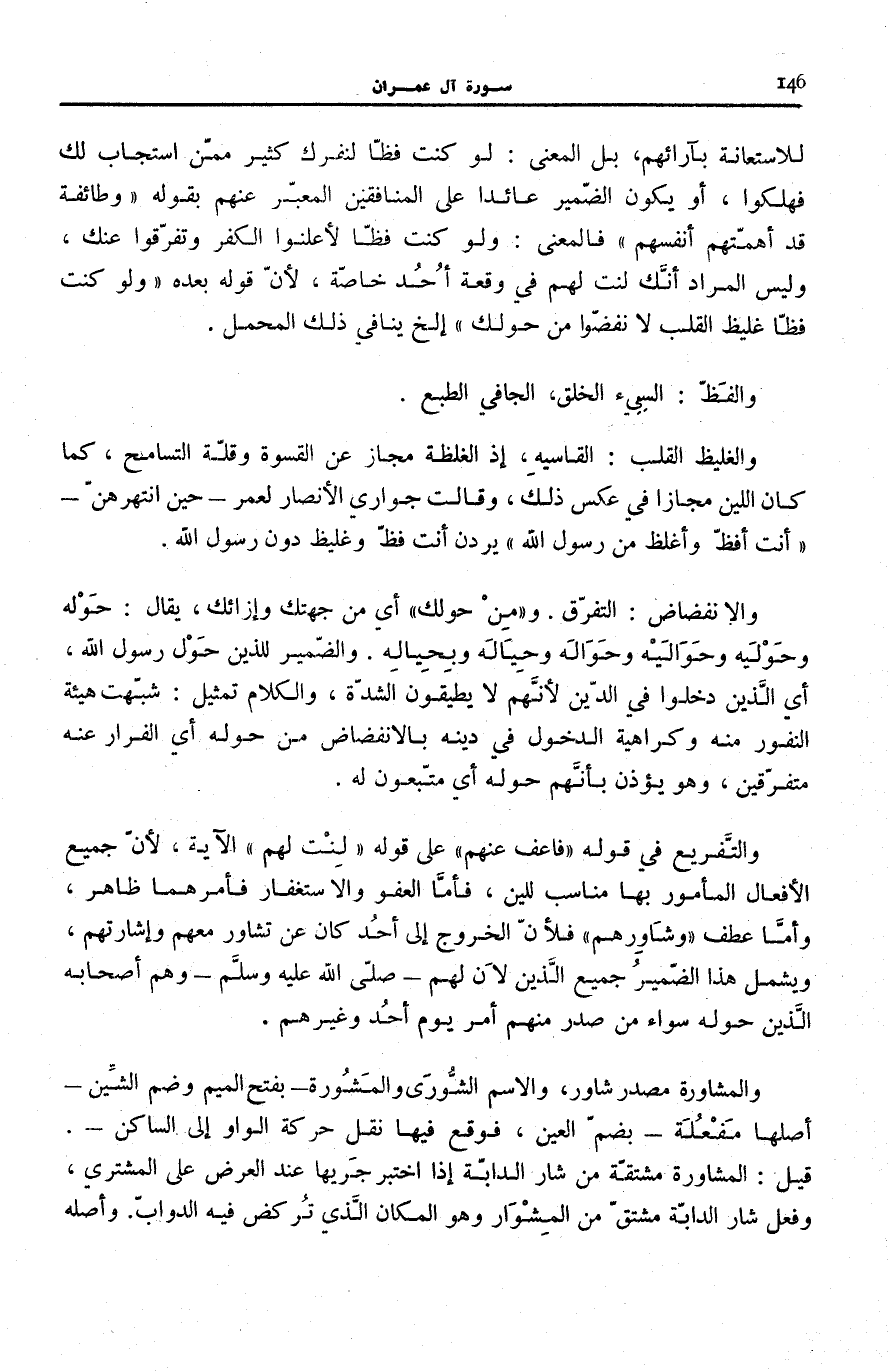 لِلِاسْتِعَانَةِ بِآرَائِهِمْ، بَلِ الْمَعْنَى: لَوْ كُنْتَ فَظًّا لَنَفَرَكَ كَثِيرٌ مِمَّنِ اسْتَجَابَ لَكَ فَهَلَكُوا، أَوْ يَكُونُ الضَّمِيرُ عَائِدًا عَلَى الْمُنَافِقِينَ الْمُعَبَّرِ عَنْهُمْ بِقَوْلِهِ: وَطائِفَةٌ قَدْ أَهَمَّتْهُمْ أَنْفُسُهُمْ [آل عمرَان: 154] فَالْمَعْنَى: وَلَوْ كُنْتَ فَظًّا لَأَعْلَنُوا الْكُفْرَ وَتَفَرَّقُوا عَنْكَ، وَلَيْسَ الْمُرَادُ أَنَّكَ لِنْتَ لَهُمْ فِي وَقْعَةِ أُحُدٍ خَاصَّةً، لِأَنَّ قَوْلَهُ بَعْدَهُ: