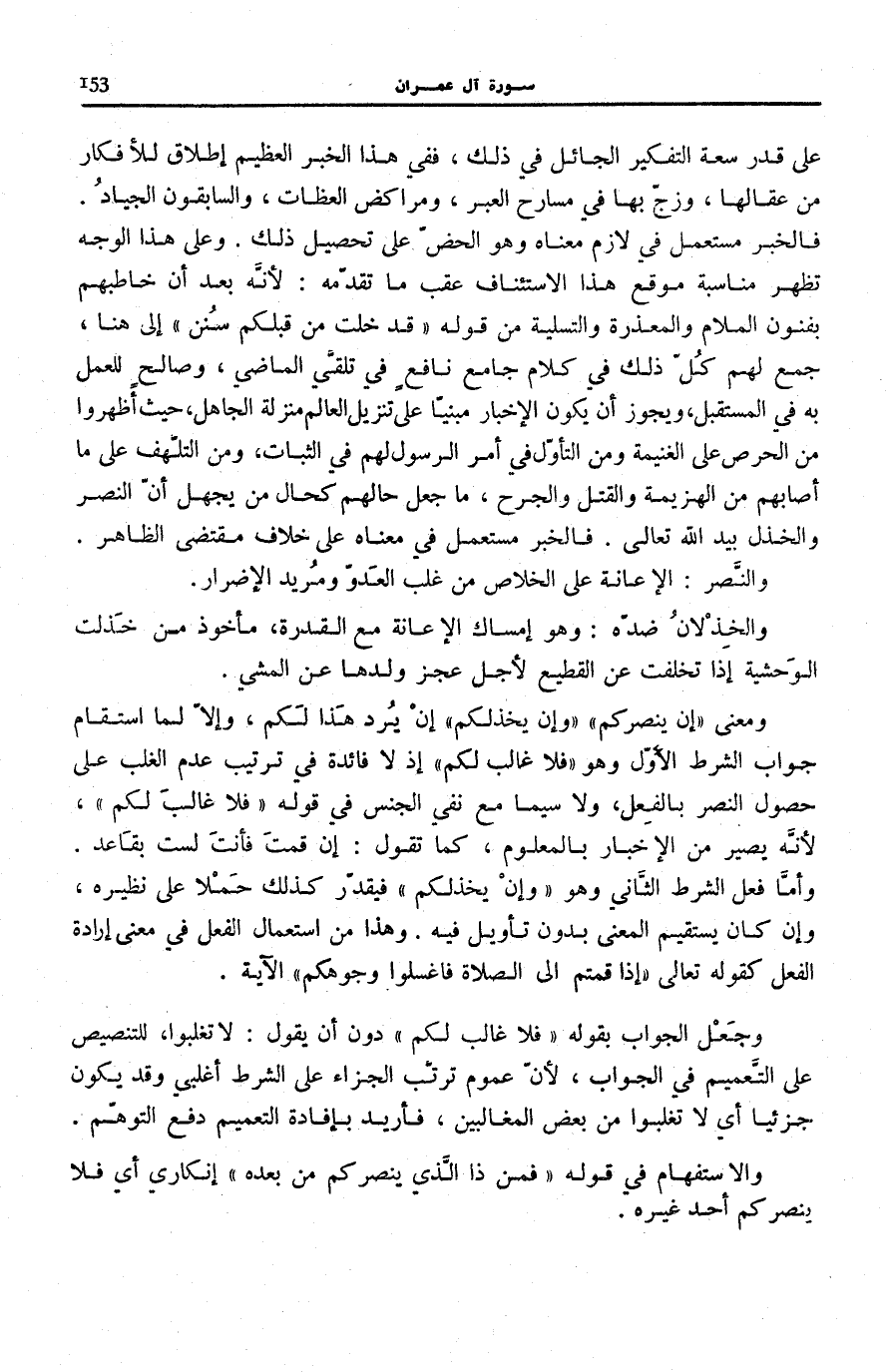 وَمَعْنَى إِنْ يَنْصُرْكُمُ وَإِنْ يَخْذُلْكُمْ إِنْ يُرِدْ هَذَا لَكُمْ، وَإِلَّا لَمَا اسْتَقَامَ جَوَابُ الشَّرْطِ الْأَوَّلِ، وَهُوَ فَلا غالِبَ لَكُمْ إِذْ لَا فَائِدَةَ فِي تَرْتِيبِ عَدَمِ الْغَلَبِ عَلَى حُصُولِ النَّصْرِ بِالْفِعْلِ، وَلَا سِيَّمَا مَعَ نَفْيِ الْجِنْسِ فِي قَوْلِهِ: فَلا غالِبَ لَكُمْ، لِأَنَّهُ يَصِيرُ مِنَ الْإِخْبَارِ بِالْمَعْلُومِ، كَمَا تَقُولُ: إِنْ قُمْتَ فَأَنْتَ لَسْتَ بِقَاعِدٍ. وَأَمَّا فِعْلُ الشَّرْطِ الثَّانِي وَهُوَ: