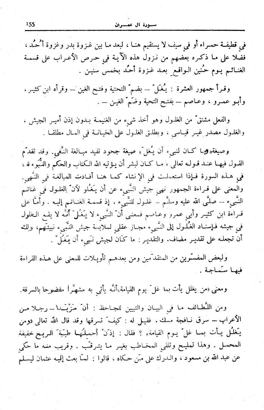 فِي قَطِيفَةٍ حَمْرَاءَ أَوْ فِي سَيْفٍ لَا يَسْتَقِيمُ هُنَا لِبُعْدِ مَا بَيْنَ غَزْوَةِ بَدْرٍ وَغَزْوَةِ أُحُدٍ فَضْلًا عَلَى مَا ذَكَرَهُ بَعْضُهُمْ مِنْ نُزُولِ هَذِهِ الْآيَةِ فِي حِرْصِ الْأَعْرَابِ عَلَى قِسْمَةِ الْغَنَائِمِ يَوْمَ حُنَيْنٍ الْوَاقِعِ بَعْدَ غَزْوَةِ أُحُدٍ بِخَمْسِ سِنِينَ.