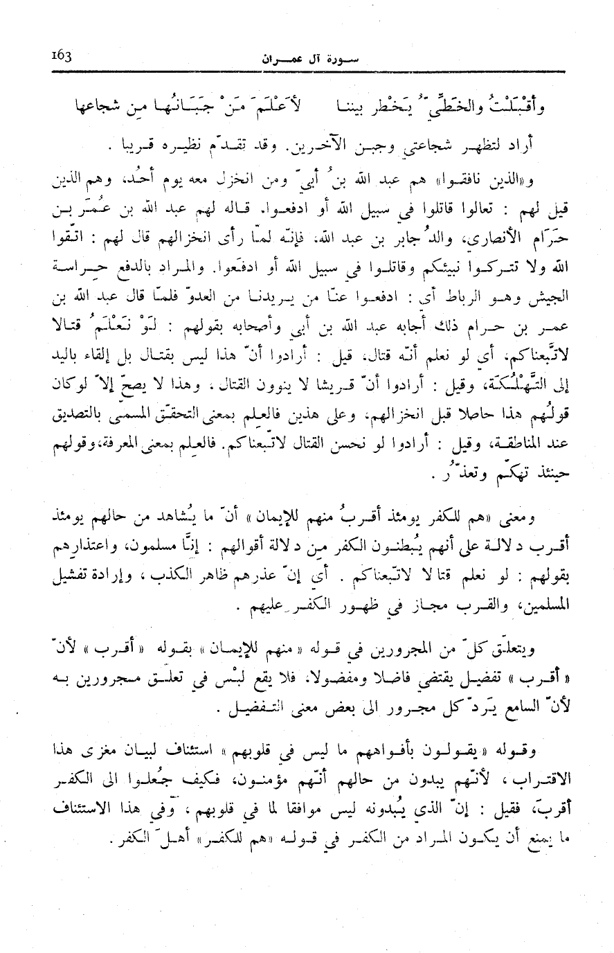 وَمَعْنَى هُمْ لِلْكُفْرِ يَوْمَئِذٍ أَقْرَبُ مِنْهُمْ لِلْإِيمانِ أَنَّ مَا يُشَاهَدُ مِنْ حَالِهِمْ يَوْمَئِذٍ أَقْرَبُ دلَالَة على أَنهم يبطنون الْكُفْرِ مِنْ دَلَالَةِ أَقْوَالِهِمْ: إِنَّا مُسْلِمُونَ، وَاعْتِذَارِهِمْ بِقَوْلِهِمْ: لَوْ نَعْلَمُ قِتَالًا لَاتَّبَعْنَاكُمْ. أَيْ إِنَّ عُذْرَهُمْ ظَاهِرُ الْكَذِبِ، وَإِرَادَةِ تَفْشِيلِ الْمُسْلِمِينَ، وَالْقُرْبِ مَجَازٌ فِي ظُهُورِ الْكُفْرِ عَلَيْهِمْ.