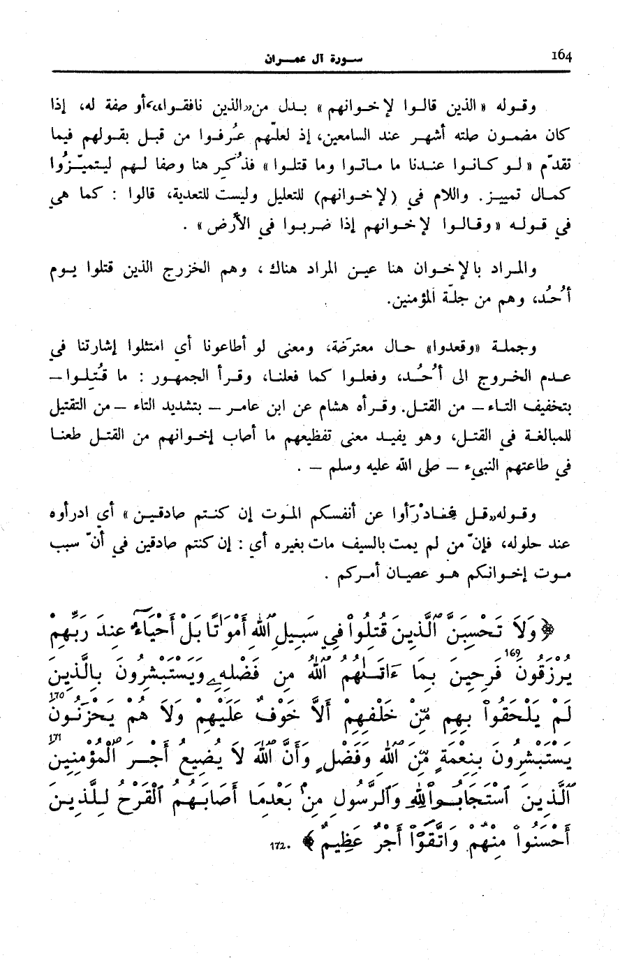 وَلا تَحْسَبَنَّ الَّذِينَ قُتِلُوا فِي سَبِيلِ اللَّهِ أَمْواتاً بَلْ أَحْياءٌ عِنْدَ رَبِّهِمْ يُرْزَقُونَ (169) فَرِحِينَ بِما آتاهُمُ اللَّهُ مِنْ فَضْلِهِ وَيَسْتَبْشِرُونَ بِالَّذِينَ لَمْ يَلْحَقُوا بِهِمْ مِنْ خَلْفِهِمْ أَلاَّ خَوْفٌ عَلَيْهِمْ وَلا هُمْ يَحْزَنُونَ (170) يَسْتَبْشِرُونَ بِنِعْمَةٍ مِنَ اللَّهِ وَفَضْلٍ وَأَنَّ اللَّهَ لَا يُضِيعُ أَجْرَ الْمُؤْمِنِينَ (171) الَّذِينَ اسْتَجابُوا لِلَّهِ وَالرَّسُولِ مِنْ بَعْدِ مَا أَصابَهُمُ الْقَرْحُ لِلَّذِينَ أَحْسَنُوا مِنْهُمْ وَاتَّقَوْا أَجْرٌ عَظِيمٌ