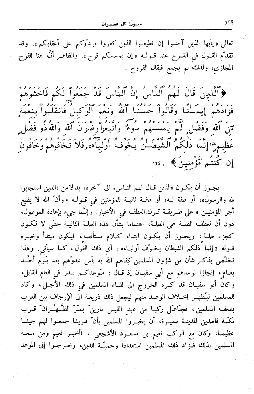 إِنَّما ذلِكُمُ الشَّيْطانُ يُخَوِّفُ أَوْلِياءَهُ [آل عمرَان: 175] أَيْ ذَلِكَ الْقَوْلُ، كَمَا سَيَأْتِي. وَهَذَا تَخَلُّصٌ بِذِكْرِ شَأْن من شؤون الْمُسْلِمِينَ كَفَاهُمُ اللَّهُ بِهِ بَأْسَ عَدُوِّهِمْ بَعْدَ يَوْمِ أُحُدٍ بِعَامٍ، إِنْجَازًا لِوَعْدِهِمْ مَعَ أَبِي سُفْيَانَ إِذْ قَالَ: مَوْعِدُكُمْ بَدْرٌ فِي الْعَامِ الْقَابِلِ، وَكَانَ أَبُو سُفْيَانَ قَدْ كَرِهَ الْخُرُوجَ إِلَى لِقَاءِ الْمُسْلِمِينَ فِي ذَلِكَ الْأَجَلِ، وَكَادَ لِلْمُسْلِمِينَ لِيُظْهِرَ إِخْلَافَ الْوَعْدِ مِنْهُمْ لِيَجْعَلَ ذَلِكَ ذَرِيعَةً إِلَى الْإِرْجَافِ بَيْنَ الْعَرَبِ بِضَعْفِ الْمُسْلِمِينَ، فَجَاعَلَ رَكْبًا مِنْ عَبْدِ الْقَيْسِ مَارِّينَ بِمَرِّ الظَّهْرَانِ قُرْبَ مَكَّةَ قَاصِدِينَ الْمَدِينَةَ لِلْمِيرَةِ، أَنْ يُخْبِرُوا الْمُسْلِمِينَ بِأَنَّ قُرَيْشًا جَمَعُوا لَهُمْ جَيْشًا عَظِيمًا، وَكَانَ مَعَ الرَّكْبِ نُعَيْمُ بْنُ مَسْعُودٍ الْأَشْجَعِيُّ، فَأَخْبَرَ نُعَيْمٌ وَمَنْ مَعَهُ الْمُسْلِمِينَ بِذَلِكَ فَزَادَ ذَلِكَ الْمُسْلِمِينَ اسْتِعْدَادًا وَحَمِيَّةً لِلدِّينِ، وَخَرَجُوا إِلَى الْمَوْعِدِ