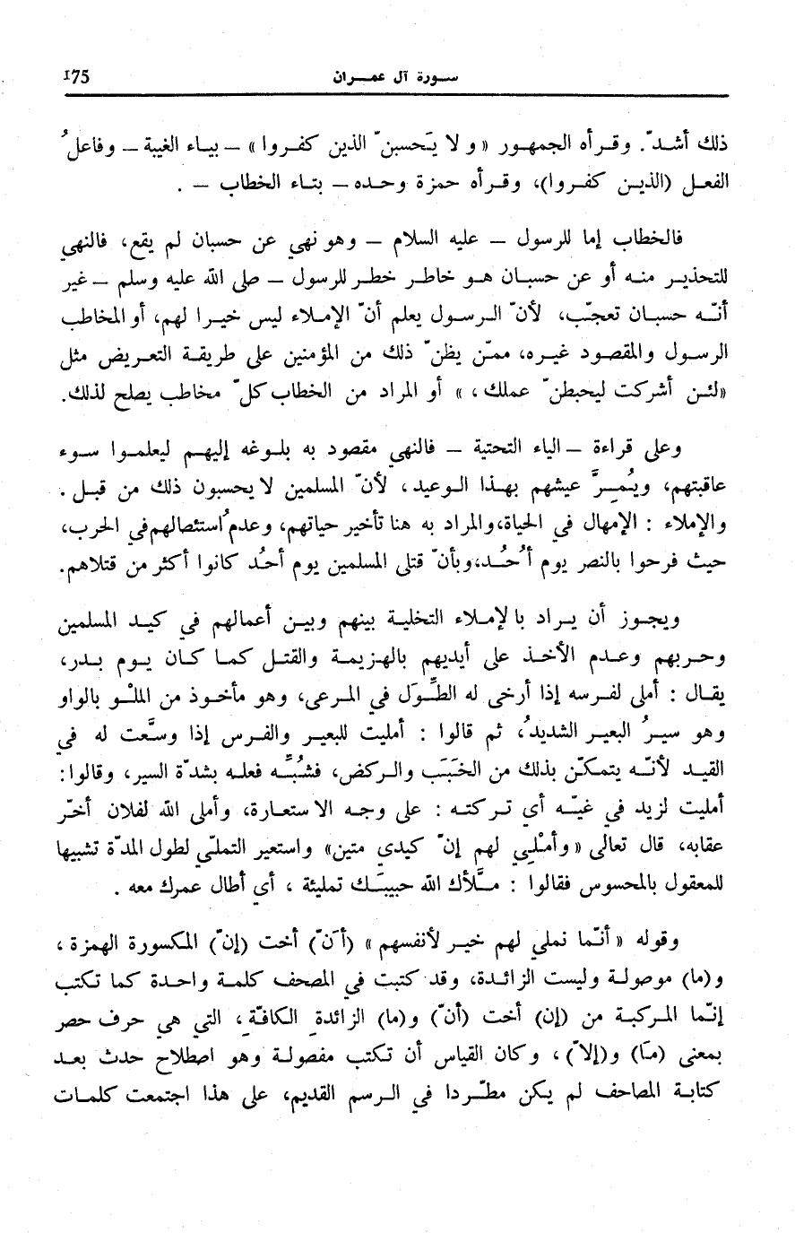 وَقَوْلُهُ: أَنَّما نُمْلِي لَهُمْ خَيْرٌ لِأَنْفُسِهِمْ (أَنَّ) أُخْتُ (إِنَّ) الْمَكْسُورَةِ الْهَمْزَةِ، وَ (مَا) مَوْصُولَةٌ وَلَيْسَتِ الزَّائِدَةُ، وَقَدْ كُتِبَتْ فِي الْمُصْحَفِ كَلِمَةً وَاحِدَةً كَمَا تُكْتَبُ إِنَّمَا الْمُرَكَّبَةُ مِنْ (إِنَّ) أُخْتِ (أَنَّ) وَ (مَا) الزَّائِدَةِ الْكَافَّةِ، الَّتِي هِيَ حَرْفُ حَصْرٍ بِمَعْنَى (مَا) وَ (إِلَّا) ، وَكَانَ الْقِيَاسُ أَنْ تُكْتَبَ مَفْصُولَةً وَهُوَ اصْطِلَاحٌ حَدَثَ بَعْدَ كِتَابَةِ الْمَصَاحِفِ لَمْ يَكُنْ مُطَّرِدًا فِي الرَّسْمِ الْقَدِيمِ، عَلَى هَذَا اجْتَمَعَتْ كَلِمَاتُ