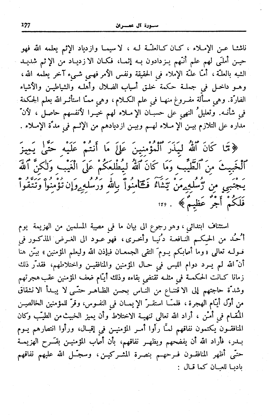 مَا كانَ اللَّهُ لِيَذَرَ الْمُؤْمِنِينَ عَلى مَا أَنْتُمْ عَلَيْهِ حَتَّى يَمِيزَ الْخَبِيثَ مِنَ الطَّيِّبِ وَما كانَ اللَّهُ لِيُطْلِعَكُمْ عَلَى الْغَيْبِ وَلكِنَّ اللَّهَ يَجْتَبِي مِنْ رُسُلِهِ مَنْ يَشاءُ فَآمِنُوا بِاللَّهِ وَرُسُلِهِ وَإِنْ تُؤْمِنُوا وَتَتَّقُوا فَلَكُمْ أَجْرٌ عَظِيمٌ (179)
