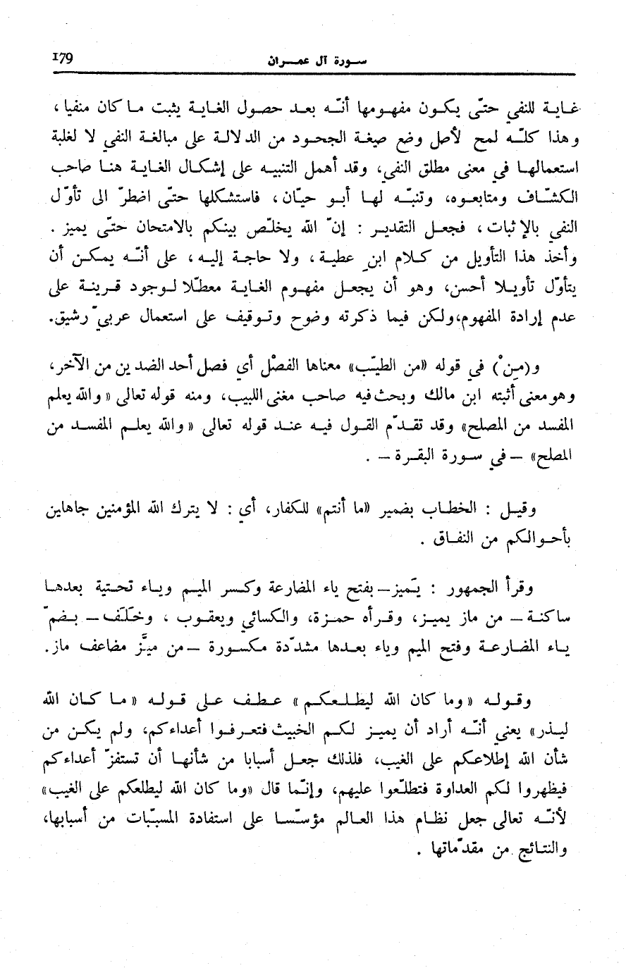 غَايَةً لِلنَّفْيِ حَتَّى يَكُونَ مَفْهُومُهَا أَنَّهُ بَعْدَ حُصُولِ الْغَايَةِ يَثْبُتُ مَا كَانَ مَنْفِيًّا، وَهَذَا كُلُّهُ لَمْحٌ لِأَصْلِ وَضْعِ صِيغَةِ الْجُحُودِ مِنَ الدَّلَالَةِ عَلَى مُبَالَغَةِ النَّفْيِ لَا لِغَلَبَةِ اسْتِعْمَالِهَا فِي مَعْنَى مُطْلَقِ النَّفْيِ، وَقَدْ أَهْمَلَ التَّنْبِيهَ عَلَى إِشْكَالِ الْغَايَةِ هُنَا صَاحِبُ «الْكَشَّافِ» وَمُتَابِعُوهُ، وَتَنَبَّهَ لَهَا أَبُو حَيَّانٍ، فَاسْتَشْكَلَهَا حَتَّى اضطرّ إِلَى تأوّل النَّفْيِ بِالْإِثْبَاتِ، فَجَعَلَ التَّقْدِيرَ: إِنَّ اللَّهَ يُخَلِّصُ بَيْنَكُمْ بِالِامْتِحَانِ، حَتَّى يَمِيزَ. وَأَخَذَ هَذَا التَّأْوِيلَ مِنْ كَلَامِ ابْنِ عَطِيَّةَ، وَلَا حَاجَةَ إِلَيْهِ عَلَى أَنَّهُ يُمْكِنُ أَنْ يَتَأَوَّلَ تَأْوِيلًا أَحْسَنَ، وَهُوَ أَنْ يَجْعَلَ مَفْهُومَ الْغَايَةِ مُعَطِّلًا لِوُجُودِ قَرِينَةٍ عَلَى عَدَمِ إِرَادَةِ الْمَفْهُومِ، وَلَكِنْ فِيمَا ذَكَرْتُهُ وُضُوحٌ وَتَوْقِيفٌ عَلَى اسْتِعْمَالٍ عَرَبِيٍّ رَشِيقٍ.