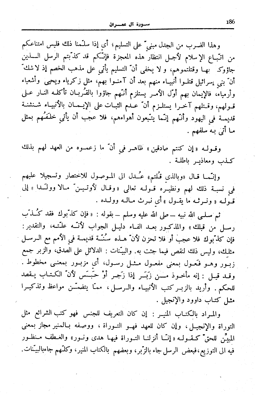 إِنَّا أَنْزَلْنَا التَّوْراةَ فِيها هُدىً وَنُورٌ [الْمَائِدَة: 44] وَالْعَطْفُ مَنْظُورٌ فِيهِ إِلَى التَّوْزِيعِ، فَبَعْضُ الرُّسُلِ جَاءَ بِالزُّبُرِ، وَبَعْضُهُمْ بِالْكِتَابِ الْمُنِيرِ، وَكُلُّهُمْ جَاءَ بِالْبَيِّنَاتِ.