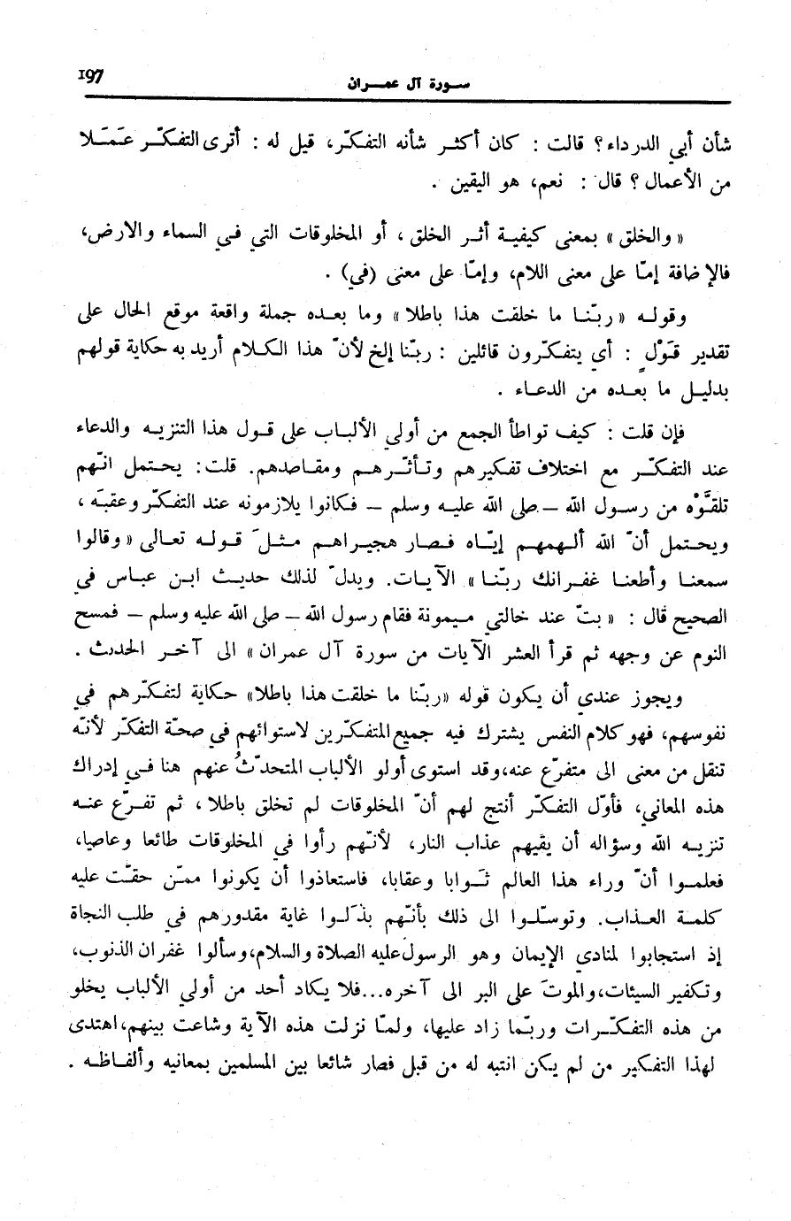 وَيَجُوزُ عِنْدِي أَنْ يَكُونَ قَوْلُهُ: رَبَّنا مَا خَلَقْتَ هَذَا باطِلًا حِكَايَةً لِتَفَكُّرِهِمْ فِي نُفُوسِهِمْ، فَهُوَ كَلَامُ النَّفْسِ يَشْتَرِكُ فِيهِ جَمِيعُ الْمُتَفَكِّرِينَ لِاسْتِوَائِهِمْ فِي صِحَّةِ التَّفَكُّرِ لِأَنَّهُ تَنَقَّلَ مِنْ مَعْنًى إِلَى مُتَفَرِّعٍ عَنْهُ، وَقَدِ اسْتَوَى أُولُو الْأَلْبَابِ الْمُتَحَدَّثِ عَنْهُمْ هُنَا فِي إِدْرَاكِ هَذِهِ الْمعَانِي، فأوّل التفكّر أَنْتَجَ لَهُمْ أَنَّ الْمَخْلُوقَاتِ لَمْ تُخْلَقْ بَاطِلًا، ثُمَّ تَفَرَّعَ عَنْهُ تَنْزِيهُ اللَّهِ وَسُؤَالِهِ أَنْ يَقِيَهُمْ عَذَابَ النَّارِ، لِأَنَّهُمْ رَأَوْا فِي الْمَخْلُوقَاتِ طَائِعًا وَعَاصِيًا، فَعَلِمُوا أَنَّ وَرَاءَ هَذَا الْعَالَمِ ثَوَابًا وَعِقَابًا، فَاسْتَعَاذُوا أَنْ يَكُونُوا مِمَّنْ حَقَّتْ عَلَيْهِ كَلِمَةُ الْعَذَابِ. وَتَوَسَّلُوا إِلَى ذَلِكَ بِأَنَّهُمْ بَذَلُوا غَايَةَ مَقْدُورِهِمْ فِي طَلَبِ النَّجَاةِ إِذِ اسْتَجَابُوا لِمُنَادِي الْإِيمَانِ وَهُوَ الرَّسُولُ عَلَيْهِ الصَّلَاةُ وَالسَّلَامُ، وَسَأَلُوا غُفْرَانَ الذُّنُوبِ، وَتَكْفِيرَ السَّيِّئَاتِ، وَالْمَوْتَ عَلَى الْبِرِّ إِلَى آخِرِهِ ... فَلَا يَكَادُ أَحَدٌ مِنْ أُولِي الْأَلْبَابِ يَخْلُو مِنْ هَذِهِ التَّفَكُّرَاتِ وَرُبَّمَا زَادَ عَلَيْهَا، وَلَمَّا نَزَلَتْ هَذِهِ الْآيَةُ وَشَاعَتْ بَيْنَهُمُ، اهْتَدَى لِهَذَا التَّفْكِيرِ مَنْ لَمْ يَكُنِ انْتَبَهَ لَهُ مِنْ قَبْلُ فَصَارَ شَائِعًا بَيْنَ الْمُسْلِمِينَ بِمَعَانِيهِ وَأَلْفَاظِهِ.