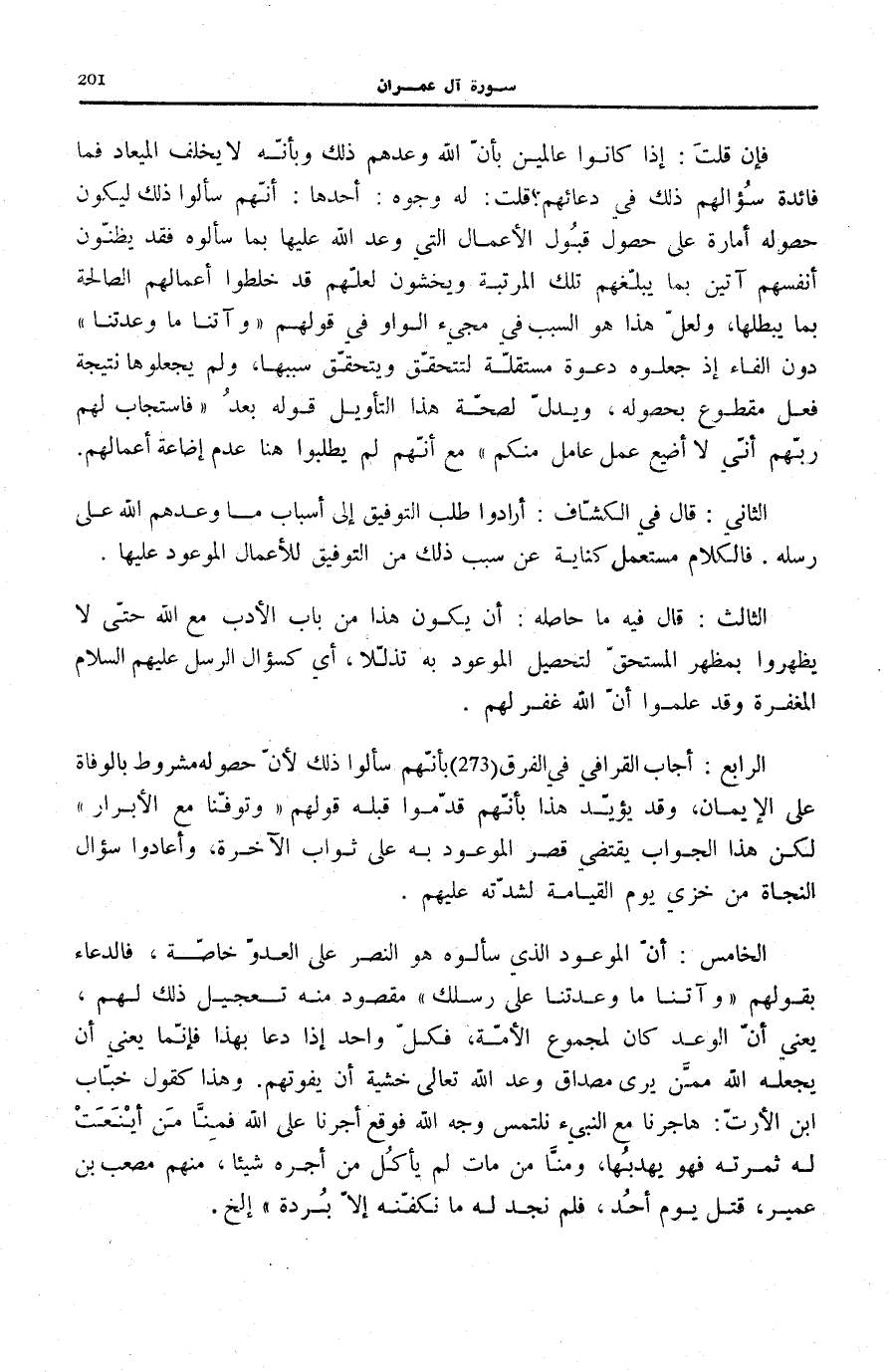الرَّابِعُ: أَجَابَ الْقَرَافِيُّ فِي الْفرق (273) بأنّهم سَأَلُوا ذَلِكَ لِأَنَّ حُصُولَهُ مَشْرُوطٌ بِالْوَفَاةِ عَلَى الْإِيمَانِ، وَقَدْ يُؤَيَّدُ هَذَا بِأَنَّهُمْ قَدَّمُوا قَبْلَهُ قَوْلَهُمْ: وَتَوَفَّنا مَعَ الْأَبْرارِ لَكِنَّ هَذَا الْجَوَابَ يَقْتَضِي قَصْرَ الْمَوْعُودِ بِهِ عَلَى ثَوَابِ الْآخِرَةِ، وَأَعَادُوا سُؤَالَ النَّجَاةِ مِنْ خِزْيِ يَوْمِ الْقِيَامَةِ لِشِدَّتِهِ عَلَيْهِمْ.