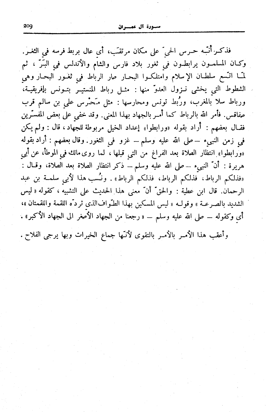 فَذَكَرَ أَنَّهُ حَرَسَ الْحَيَّ عَلَى مَكَانٍ مُرْتَقَبٍ، أَيْ عَالٍ بِرَبْطِ فَرَسِهِ فِي الثَّغْرِ. وَكَانَ الْمُسْلِمُونَ يُرَابِطُونَ فِي ثُغُورِ بِلَادِ فَارِسٍ وَالشَّامِ وَالْأَنْدَلُسِ فِي الْبَرِّ، ثُمَّ لَمَّا اتَّسَعَ سُلْطَانُ الْإِسْلَامِ وَامْتَلَكُوا الْبِحَارَ صَارَ الرِّبَاطُ فِي ثغور البخار وَهِيَ الشُّطُوطُ الَّتِي يُخْشَى نُزُولُ الْعَدُوِّ مِنْهَا: مِثْلَ رِبَاطِ الْمِنِسْتِيرِ بِتُونِسَ بِإِفْرِيقِيَّةَ، وَرِبَاطِ سَلَا بِالْمَغْرِبِ، وَرُبُطِ تُونِسَ وَمَحَارِسِهَا: مِثْلِ مَحْرَسِ عَلِيِّ بْنِ سَالِمٍ قُرْبَ صَفَاقِسَ. فَأَمَرَ اللَّهُ بِالرِّبَاطِ كَمَا أَمَرَ بِالْجِهَادِ بِهَذَا الْمَعْنَى وَقَدْ خُفِيَ عَلَى بَعْضِ الْمُفَسِّرِينَ فَقَالَ بَعْضُهُمْ: أَرَادَ بِقَوْلِهِ: وَرابِطُوا إِعْدَادَ الْخَيْلِ مَرْبُوطَةً لِلْجِهَادِ، قَالَ: وَلَمْ يَكُنْ فِي زَمَنِ النَّبِيءِ صَلَّى اللهُ عَلَيْهِ وَسَلَّمَ غَزْوٌ فِي الثُّغُورِ. وَقَالَ بَعْضُهُمْ: