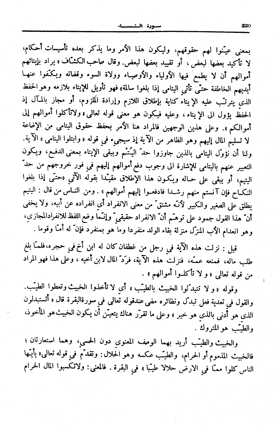 قِيلَ: نَزَلَتْ هَذِهِ الْآيَةُ فِي رَجُلٍ مِنْ غَطَفَانَ كَانَ لَهُ ابْنُ أَخٍ فِي حِجْرِهِ، فَلَمَّا بَلَغَ طَلَبَ مَالَهُ، فَمَنَعَهُ عَمُّهُ، فَنَزَلَتْ هَذِهِ الْآيَةُ، فَرَدَّ الْمَالَ لِابْنِ أَخِيهِ، وَعَلَى هَذَا فَهُوَ الْمُرَادُ مِنْ قَوْلِهِ تَعَالَى: وَلا تَأْكُلُوا أَمْوالَهُمْ.