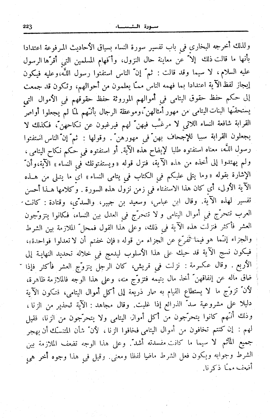 شَافِعَةَ النِّسَاءِ اللَّاتِي لَا مُرَغِّبَ فِيهِنَّ لَهُمْ فَيَرْغَبُونَ عَنْ نِكَاحِهِنَّ، فَكَذَلِكَ لَا يَجْعَلُونَ الْقَرَابَةَ سَبَبًا لِلْإِجْحَافِ بِهِنَّ فِي مُهُورِهِنَّ. وَقَوْلُهَا: ثُمَّ إِنَّ النَّاسَ اسْتَفْتَوْا رَسُولَ اللَّهِ، مَعْنَاهُ اسْتَفْتَوْهُ طَلَبًا لِإِيضَاحِ هَذِهِ الْآيَةِ. أَوِ اسْتَفْتَوْهُ فِي حُكْمِ نِكَاح الْيَتَامَى، وَله يَهْتَدُوا إِلَى أَخْذِهِ مِنْ هَذِهِ الْآيَةِ، فَنَزَلَ قَوْلُهُ: وَيَسْتَفْتُونَكَ فِي النِّساءِ الْآيَةَ، وَأَنَّ الْإِشَارَةَ بِقَوْلِهِ: وَما يُتْلى عَلَيْكُمْ فِي الْكِتابِ فِي يَتامَى النِّساءِ أَيْ مَا يُتْلَى مِنْ هَذِهِ الْآيَةِ الْأُولَى، أَيْ كَانَ هَذَا الِاسْتِفْتَاءُ فِي زَمَنِ نُزُولِ هَذِهِ السُّورَةِ. وَكَلَامُهَا هَذَا أَحْسَنُ تَفْسِيرٍ لِهَذِهِ الْآيَةِ. وَقَالَ ابْنُ عَبَّاسٍ، وَسَعِيدُ بْنُ جُبَيْرٍ، وَالسُّدِّيُّ، وَقَتَادَةُ: كَانَتِ الْعَرَبُ تَتَحَرَّجُ فِي أَمْوَالِ الْيَتَامَى وَلَا تَتَحَرَّجُ فِي الْعَدْلِ بَيْنَ النِّسَاءِ، فَكَانُوا يَتَزَوَّجُونَ الْعَشْرَ فَأَكْثَرَ فَنَزَلَتْ هَذِهِ الْآيَةُ فِي ذَلِكَ، وَعَلَى هَذَا القَوْل فمحلّ الْمُلَازَمَةِ بَيْنَ الشَّرْطِ وَالْجَزَاءِ إِنَّمَا هُوَ فِيمَا تَفَرَّعَ عَنِ الْجَزَاءِ مِنْ قَوْلِهِ: فَإِنْ خِفْتُمْ أَلَّا تَعْدِلُوا فَواحِدَةً، فَيكون نسج الْآيَةِ قَدْ حِيكَ عَلَى هَذَا الْأُسْلُوبِ لِيُدْمَجَ فِي خِلَالِهِ تَحْدِيدُ النِّهَايَةِ إِلَى الْأَرْبَعِ. وَقَالَ عِكْرِمَةُ: نَزَلَتْ فِي قُرَيْشٍ، كَانَ الرَّجُلُ يَتَزَوَّجُ الْعَشْرَ فَأَكْثَرَ فَإِذَا ضَاقَ مَالُهُ عَنْ إِنْفَاقِهِنَّ أَخَذَ مَالَ يَتِيمِهِ فَتَزَوَّجَ مِنْهُ، وَعَلَى هَذَا الْوَجْهِ فَالْمُلَازَمَةُ ظَاهِرَةٌ، لِأَنَّ تَزَوُّجَ مَا لَا يُسْتَطَاعُ الْقِيَامُ بِهِ صَارَ ذَرِيعَةً إِلَى أَكْلِ أَمْوَالِ الْيَتَامَى، فَتَكُونُ الْآيَةُ دَلِيلًا عَلَى مَشْرُوعِيَّةِ سَدِّ الذَّرَائِعِ إِذَا غَلَبَتْ. وَقَالَ مُجَاهِدٌ: الْآيَةُ تَحْذِيرٌ مِنَ الزِّنَا، وَذَلِكَ أَنَّهُمْ كَانُوا يَتَحَرَّجُونَ مِنْ أَكْلِ أَمْوَالِ الْيَتَامَى وَلَا يَتَحَرَّجُونَ مِنَ الزِّنَا، فَقِيلَ لَهُمْ: إِنْ كُنْتُمْ تَخَافُونَ مِنْ أَمْوَالِ الْيَتَامَى فَخَافُوا الزِّنَا، لِأَنَّ شَأْنَ الْمُتَنَسِّكَ أَنْ يَهْجُرَ جَمِيعَ الْمَآثِمِ لَا سِيَّمَا مَا كَانَتْ مَفْسَدَتُهُ أَشَدَّ. وَعَلَى هَذَا الْوَجْهِ تَضْعُفُ الْمُلَازَمَةُ بَيْنَ الشَّرْطِ وَجَوَابِهِ وَيَكُونُ فِعْلُ الشَّرْطِ مَاضِيًا لَفْظًا وَمَعْنًى. وَقِيلَ فِي هَذَا وُجُوهٌ أُخَرُ هِيَ أَضْعَفُ مِمَّا ذَكَرْنَا.