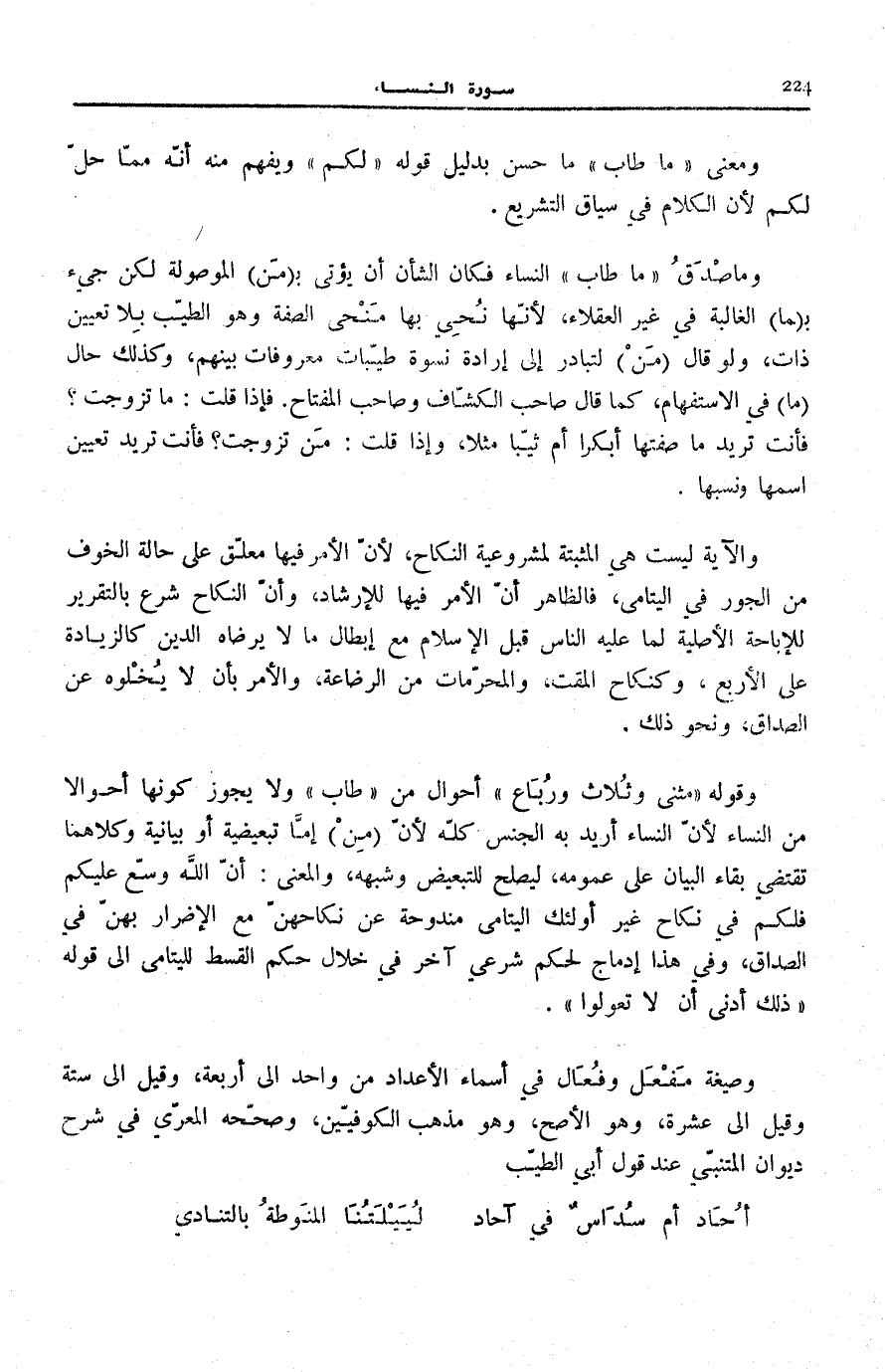 وَقَوْلُهُ: مَثْنى وَثُلاثَ وَرُباعَ أَحْوَالُ مَنْ طابَ وَلَا يَجُوزُ كَوْنُهَا أَحْوَالًا مِنَ النِّسَاءِ لِأَنَّ النِّسَاءَ أُرِيدَ بِهِ الْجِنْسُ كُلُّهُ لِأَنَّ (مِنْ) إِمَّا تَبْعِيضِيَّةٌ أَوْ بَيَانِيَّةٌ وَكِلَاهُمَا تَقْتَضِي بَقَاءَ الْبَيَانِ عَلَى عُمُومِهِ، لِيَصْلُحَ لِلتَّبْعِيضِ وَشَبَهِهِ، وَالْمَعْنَى: أَنَّ اللَّهَ وَسَّعَ عَلَيْكُمْ فَلَكُمْ فِي نِكَاحِ غَيْرِ أُولَئِكَ الْيَتَامَى مَنْدُوحَةٌ عَنْ نِكَاحِهِنَّ مَعَ الْإِضْرَارِ بِهِنَّ فِي الصَّدَاقِ، وَفِي هَذَا إِدْمَاجٌ لِحُكْمٍ شَرْعِيٍّ آخَرَ فِي خِلَالِ حُكْمِ الْقِسْطِ لِلْيَتَامَى إِلَى قَوْلِهِ: ذلِكَ أَدْنى أَلَّا تَعُولُوا.