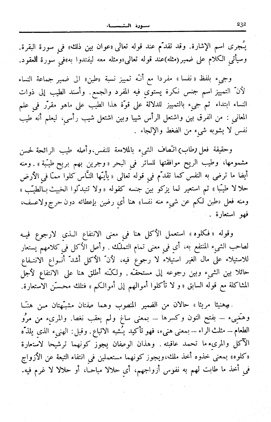 وَجِيءَ بِلَفْظِ نَفْساً مُفْرَدًا مَعَ أَنَّهُ تَمْيِيزُ نِسْبَةِ طِبْنَ إِلَى ضَمِيرِ جَمَاعَةِ النِّسَاءِ لِأَنَّ التَّمْيِيزَ اسْمُ جِنْسٍ نَكِرَةٍ يَسْتَوِي فِيهِ الْمُفْرَدُ وَالْجَمْعُ. وَأُسْنِدَ الطَّيِّبُ إِلَى ذَوَاتِ النِّسَاءِ ابْتِدَاءً ثُمَّ جِيءَ بِالتَّمْيِيزِ لِلدَّلَالَةِ عَلَى قُوَّةِ هَذَا الطَّيِّبِ عَلَى مَا هُوَ مُقَرَّرٌ فِي عِلْمِ الْمَعَانِي: مِنَ الْفَرْقِ بَيْنَ وَاشْتَعَلَ الرَّأْسُ شَيْبًا وَبَيْنَ اشْتَعَلَ شَيْبُ رَأْسِي، لِيُعْلَمَ أَنَّهُ طِيبُ نَفْسٍ لَا يَشُوبُهُ شَيْءٌ مِنَ الضَّغْطِ وَالْإِلْجَاءِ.