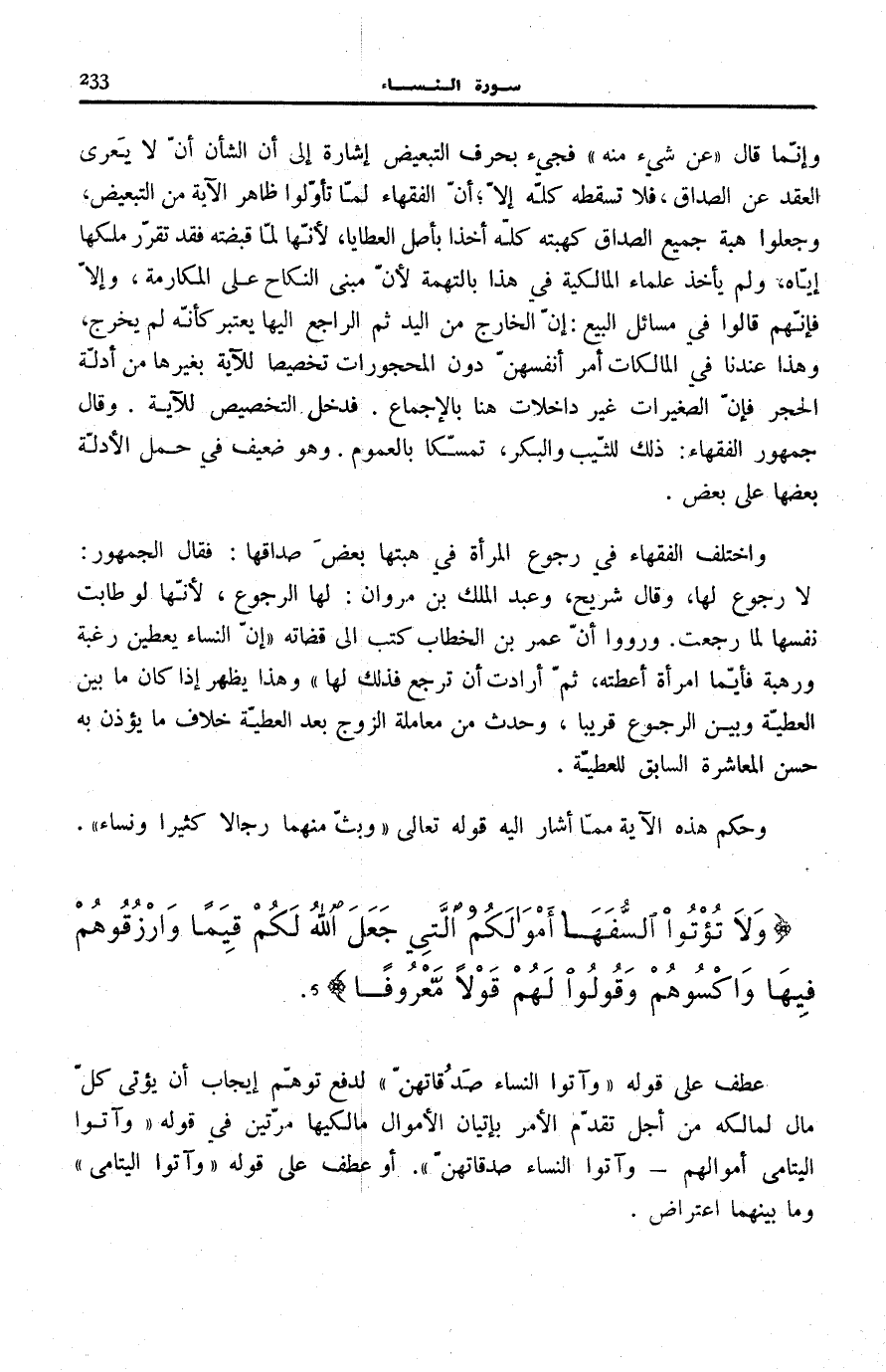 وَإِنَّمَا قَالَ: عَنْ شَيْءٍ مِنْهُ فَجِيءَ بِحَرْفِ التَّبْعِيضِ إِشَارَةً إِلَى أَنَّ الشَّأْنَ أَنْ لَا يَعْرَى الْعَقْدُ عَنِ الصَّدَاقِ، فَلَا تُسْقِطْهُ كُلَّهُ إِلَّا أَنَّ الْفُقَهَاءَ لَمَّا تَأَوَّلُوا ظَاهِرَ الْآيَةِ مِنَ التَّبْعِيضِ، وَجَعَلُوا هِبَةَ جَمِيعِ الصَّدَاقِ كَهِبَتِهِ كُلِّهِ أَخْذًا بِأَصْلِ الْعَطَايَا، لِأَنَّهَا لَمَّا قَبَضَتْهُ فَقَدْ تَقَرَّرَ مِلْكُهَا إِيَّاهُ، وَلَمْ يَأْخُذْ عُلَمَاءُ الْمَالِكِيَّةِ فِي هَذَا بِالتُّهْمَةِ لِأَنَّ مَبْنَى النِّكَاحِ عَلَى الْمُكَارَمَةِ، وَإِلَّا فَإِنَّهُمْ قَالُوا فِي مَسَائِلِ الْبَيْعِ: إِنَّ الْخَارِجَ مِنَ الْيَدِ ثُمَّ الرَّاجِعَ إِلَيْهَا يُعْتَبَرُ كَأَنَّهُ لَمْ يَخْرُجْ، وَهَذَا عِنْدَنَا فِي الْمَالِكَاتِ أَمْرَ أَنْفُسِهِنَّ دُونَ الْمَحْجُورَاتِ تَخْصِيصًا لِلْآيَةِ بِغَيْرِهَا مِنْ أَدِلَّةِ الْحَجْرِ فَإِنَّ الصَّغِيرَاتِ غَيْرَ دَاخِلَاتٍ هُنَا بِالْإِجْمَاعِ. فَدَخَلَ التَّخْصِيصُ لِلْآيَةِ. وَقَالَ جُمْهُورُ الْفُقَهَاءِ: ذَلِكَ لِلثَّيِّبِ وَالْبِكْرِ، تَمَسُّكًا بِالْعُمُومِ. وَهُوَ ضَعِيفٌ فِي حَمْلِ الْأَدِلَّةِ بَعْضِهَا عَلَى بَعْضٍ.
